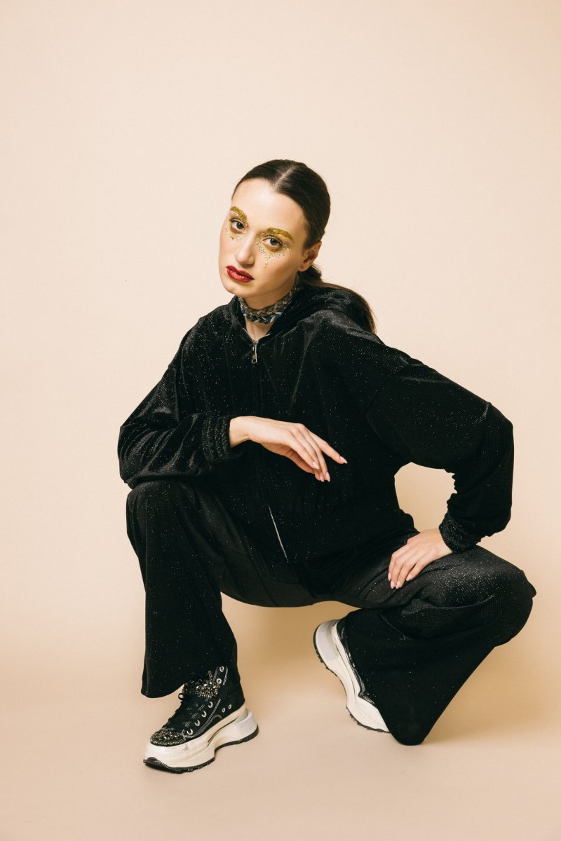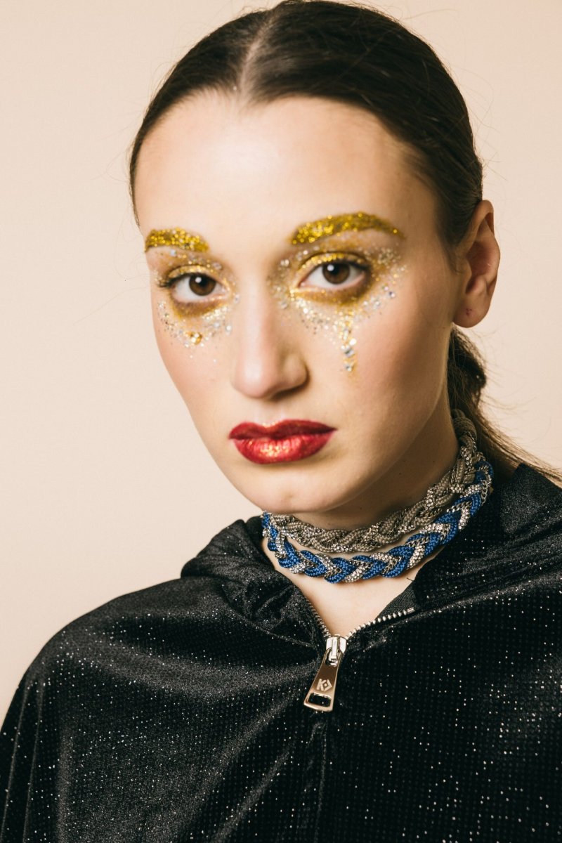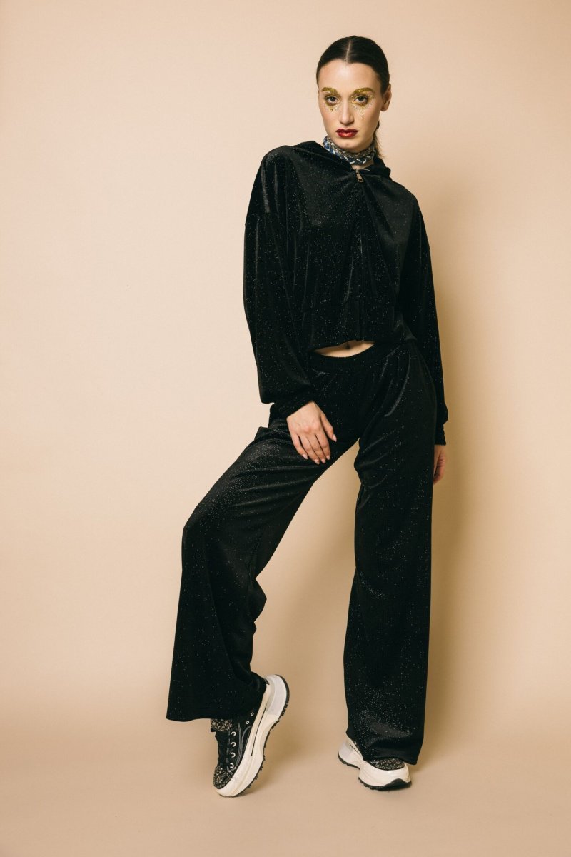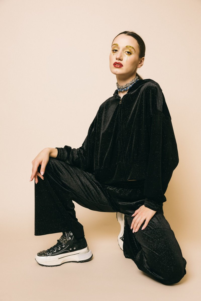 Felpa corta con cappuccio in ciniglia glitterata, chiusura con zip