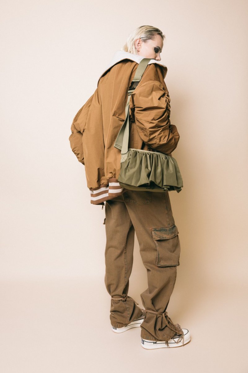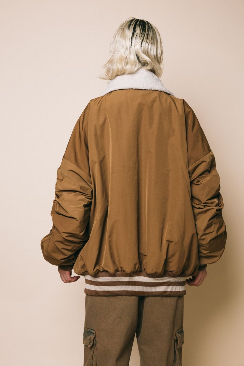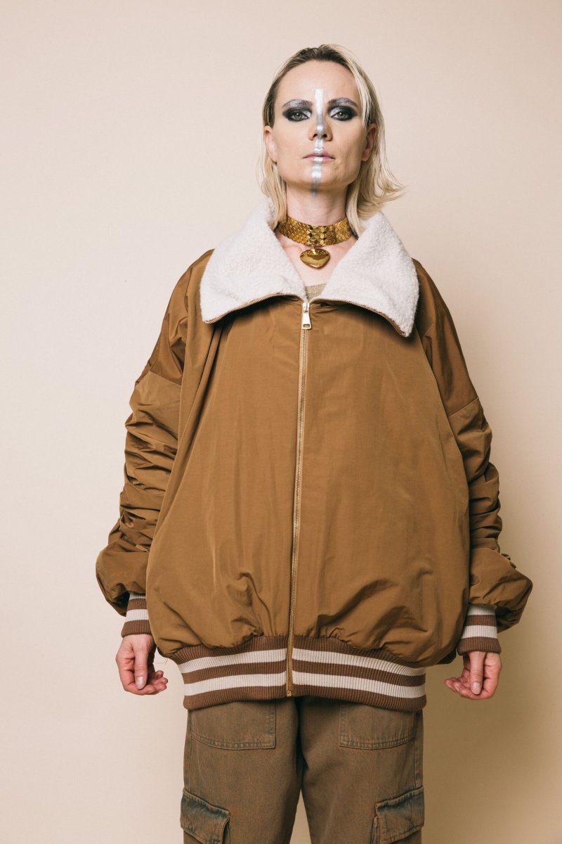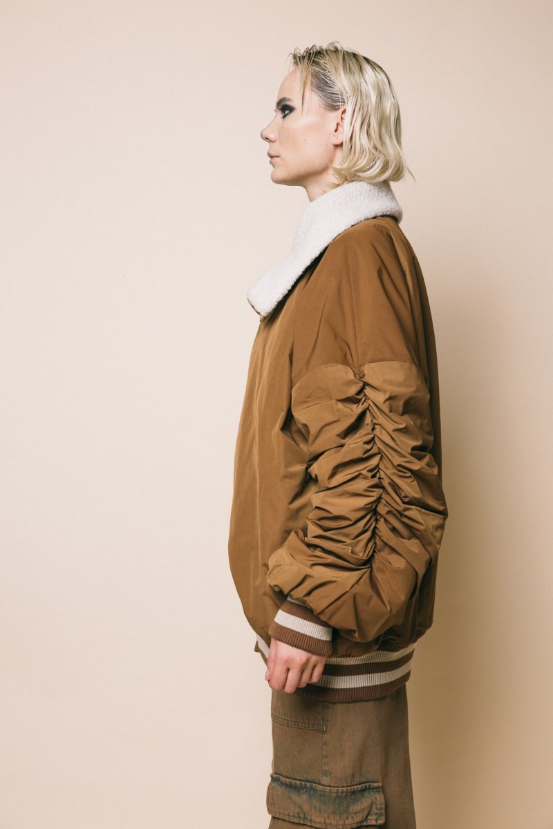 Giubbotto in tessuto nylon rivestito in montone, con polsini e bordo con elastico a righe