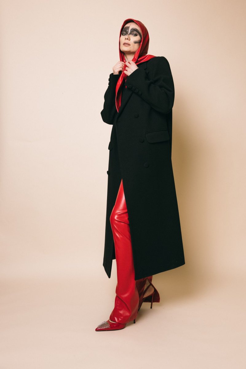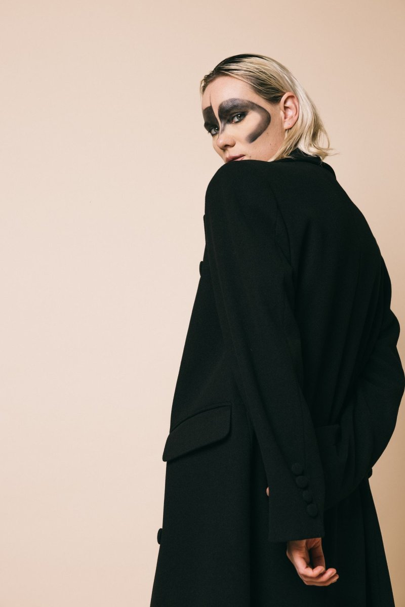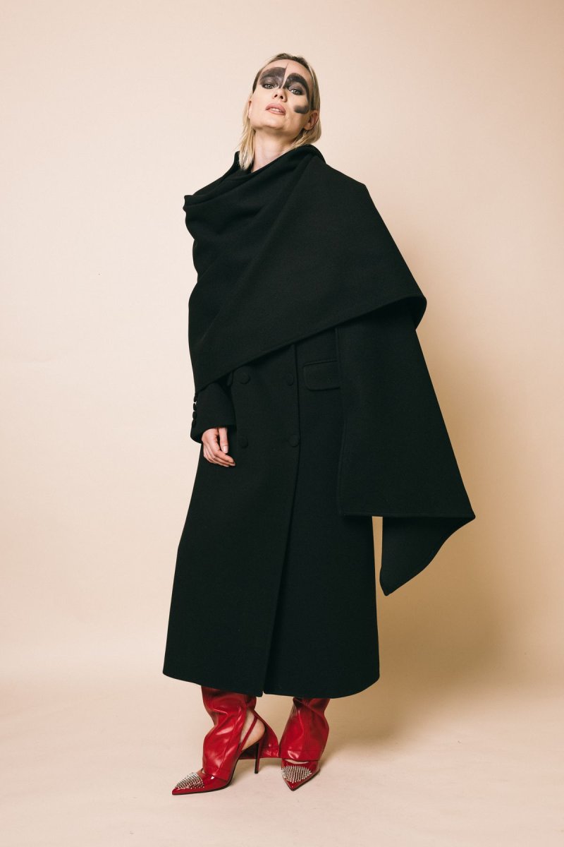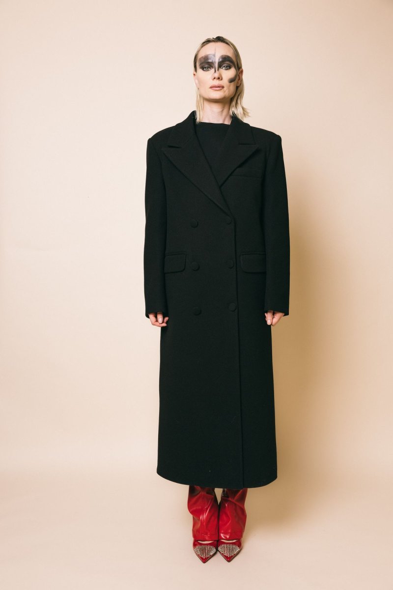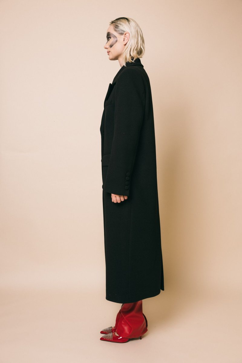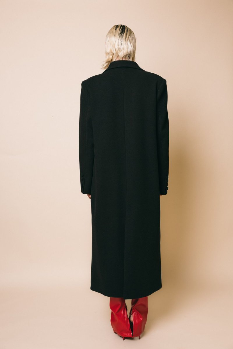 Cappotto doppiopetto in panno morbido, spacco posteriore, bottoni ricoperti, tasche con pattina