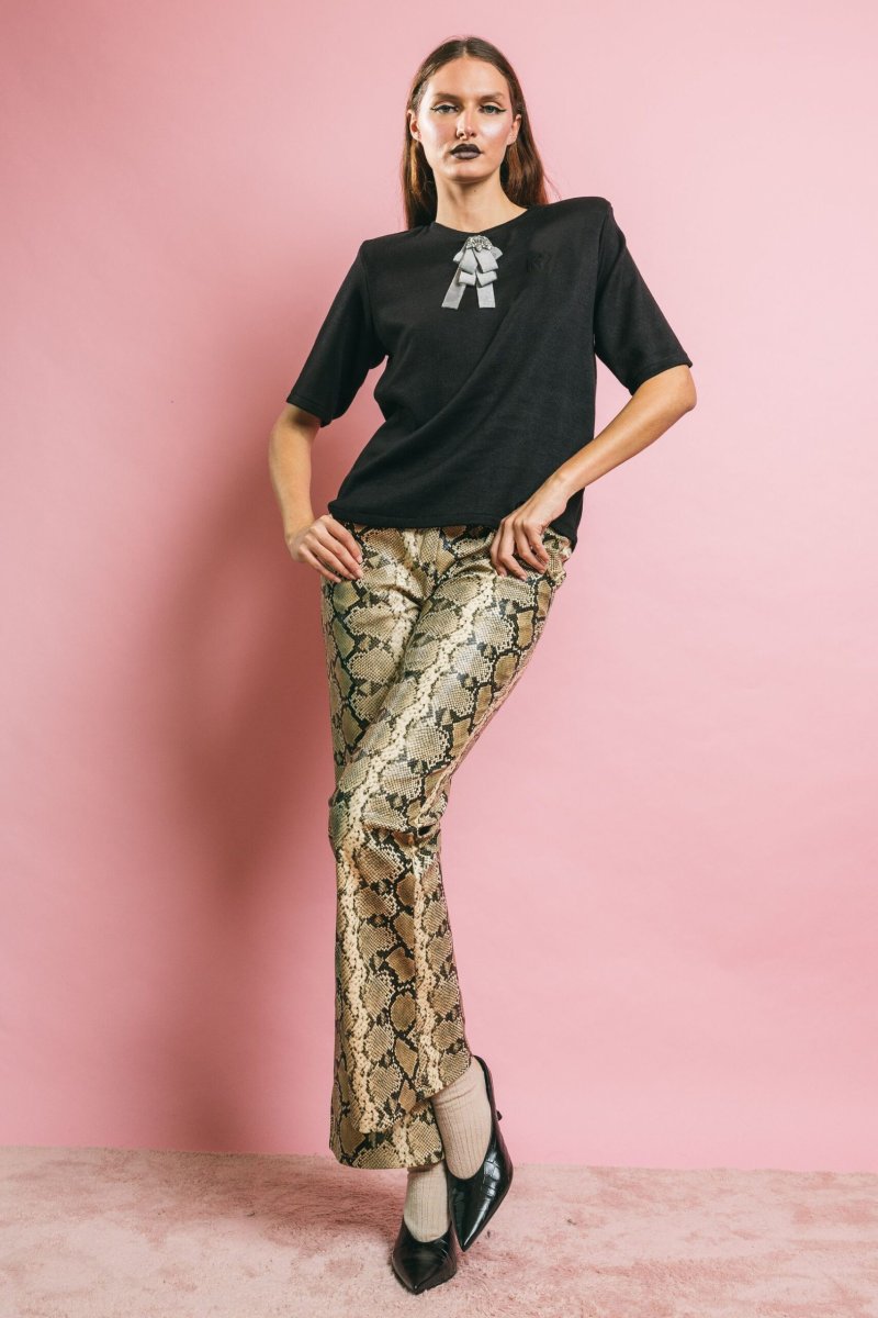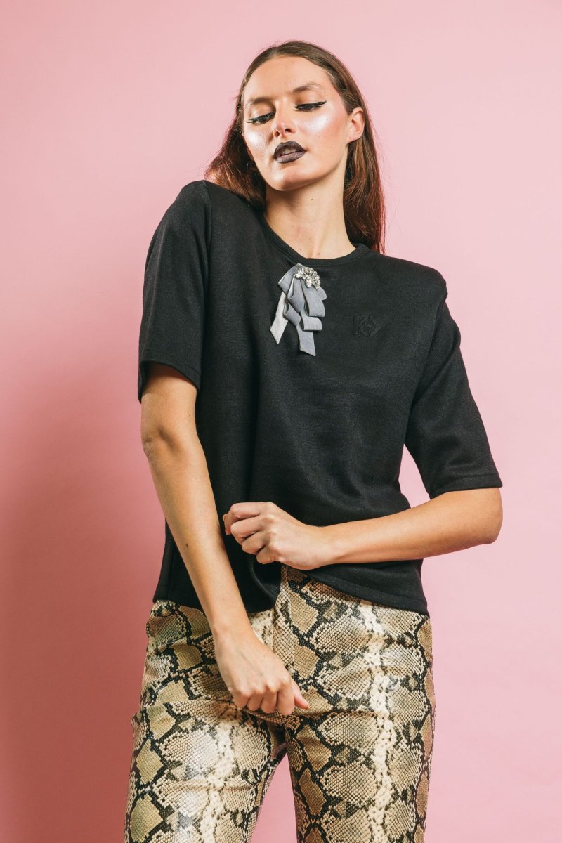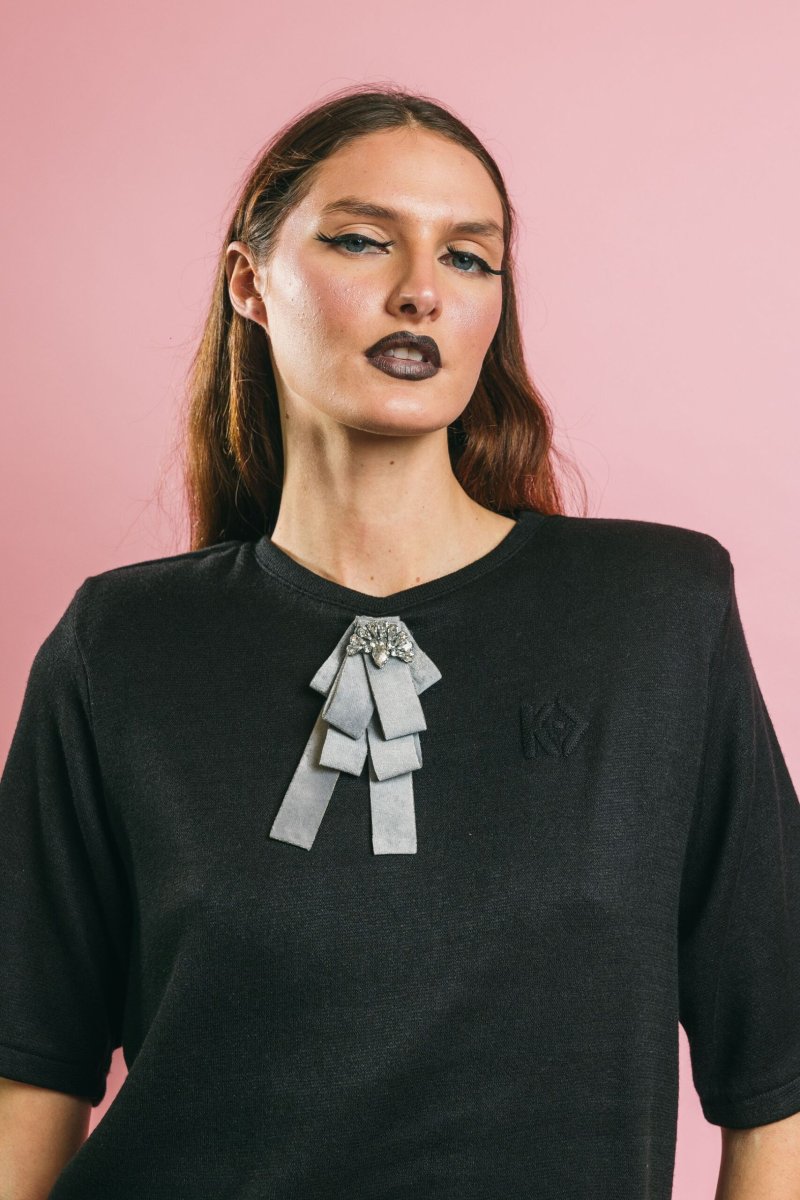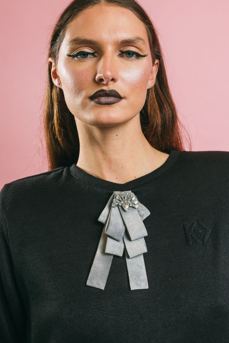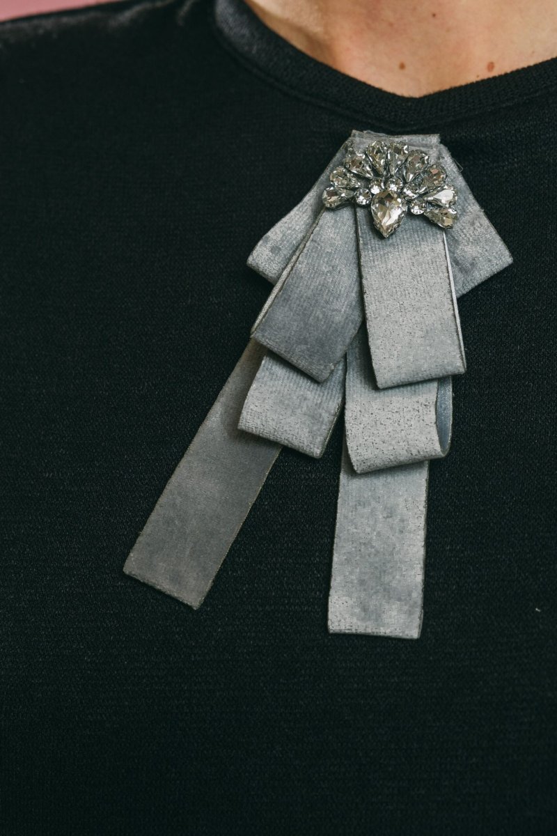 Spilla fiocchetto in velluto arricchito da dettagli gioiello in cristalli crystal. Questo accessorio raffinato aggiunge un tocco di femminilità e personalità a qualsiasi outfit, trasformando anche i look più semplici in composizioni ricercate e sofisticate.