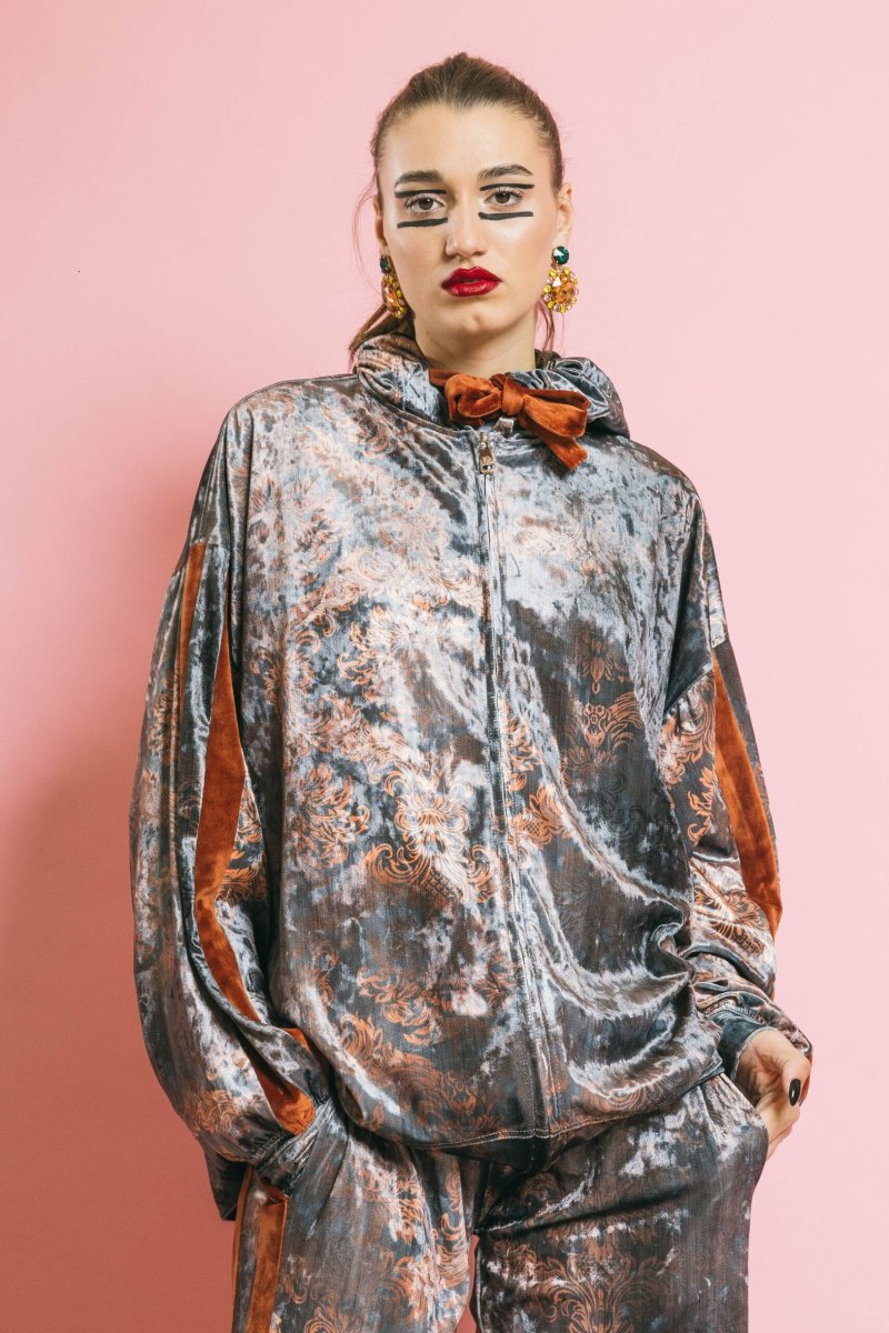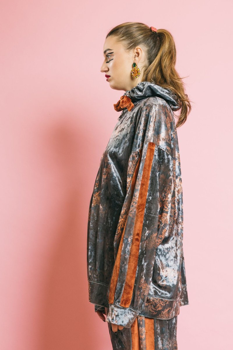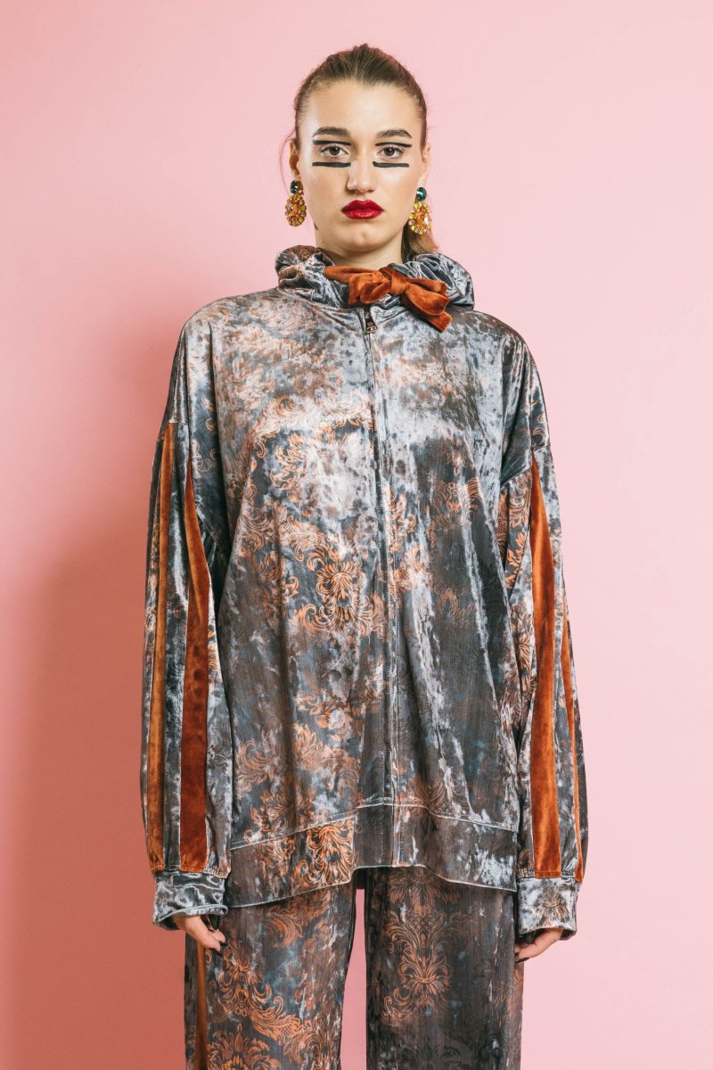 Felpa in ciniglia lavorata con fantasia dal richiamo vintage. Il fondo grigio antracite, profondo e sofisticato, è valorizzato dai motivi a contrasto in tonalità pesca tendente al ruggine, creando un effetto elegante e originale. Le bande sulle maniche e il cappuccio con culisse in ruggine aggiungono un tocco di femminilità e carattere, senza rinunciare al comfort e alla praticità. Un capo essenziale e versatile, perfetto per completare outfit casual con stile, personalità e un delicato tocco di femminilità.