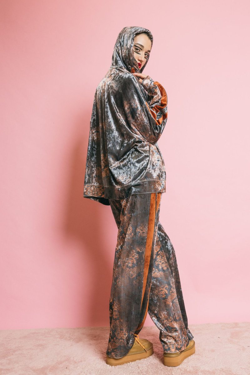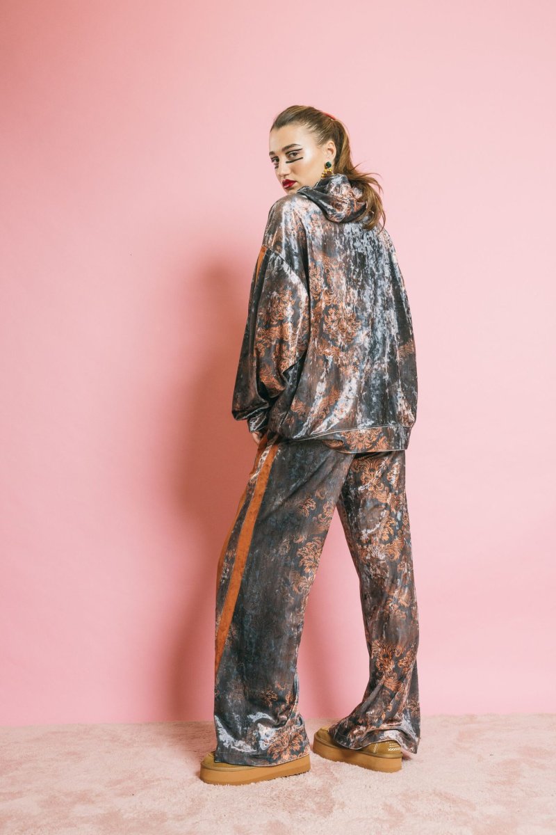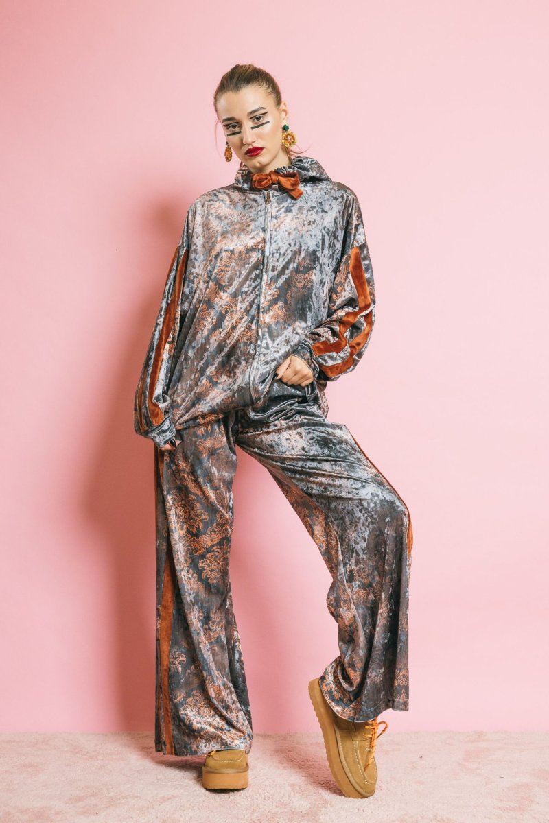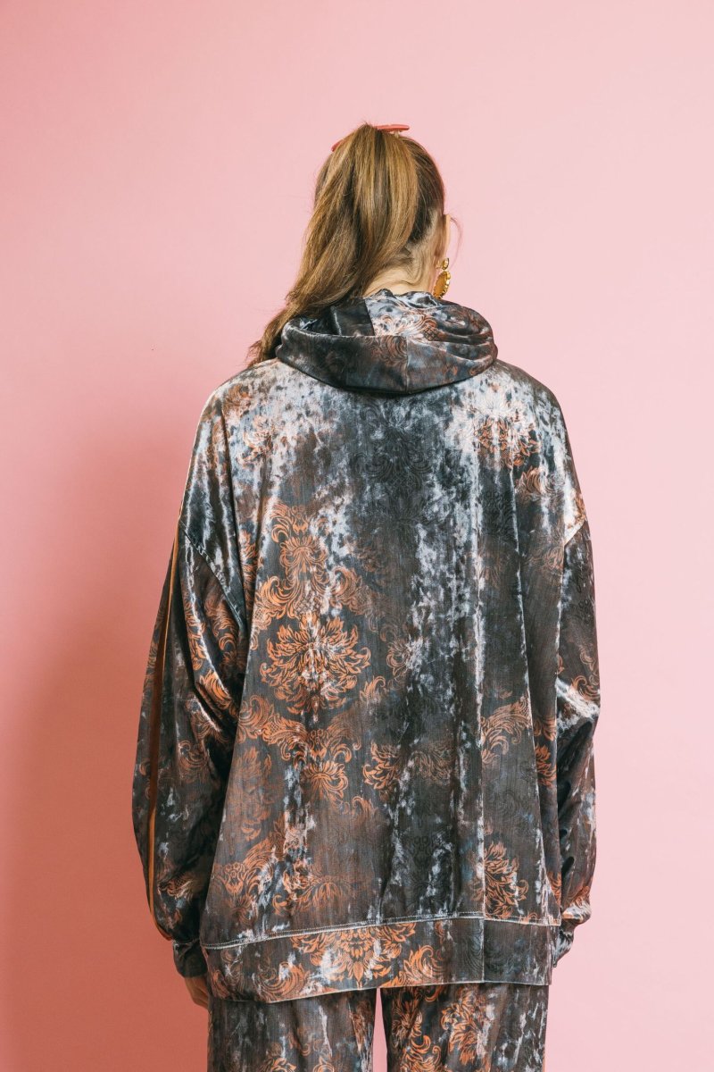 Felpa in ciniglia lavorata con fantasia dal richiamo vintage. Il fondo grigio antracite, profondo e sofisticato, è valorizzato dai motivi a contrasto in tonalità pesca tendente al ruggine, creando un effetto elegante e originale. Le bande sulle maniche e il cappuccio con culisse in ruggine aggiungono un tocco di femminilità e carattere, senza rinunciare al comfort e alla praticità. Un capo essenziale e versatile, perfetto per completare outfit casual con stile, personalità e un delicato tocco di femminilità.