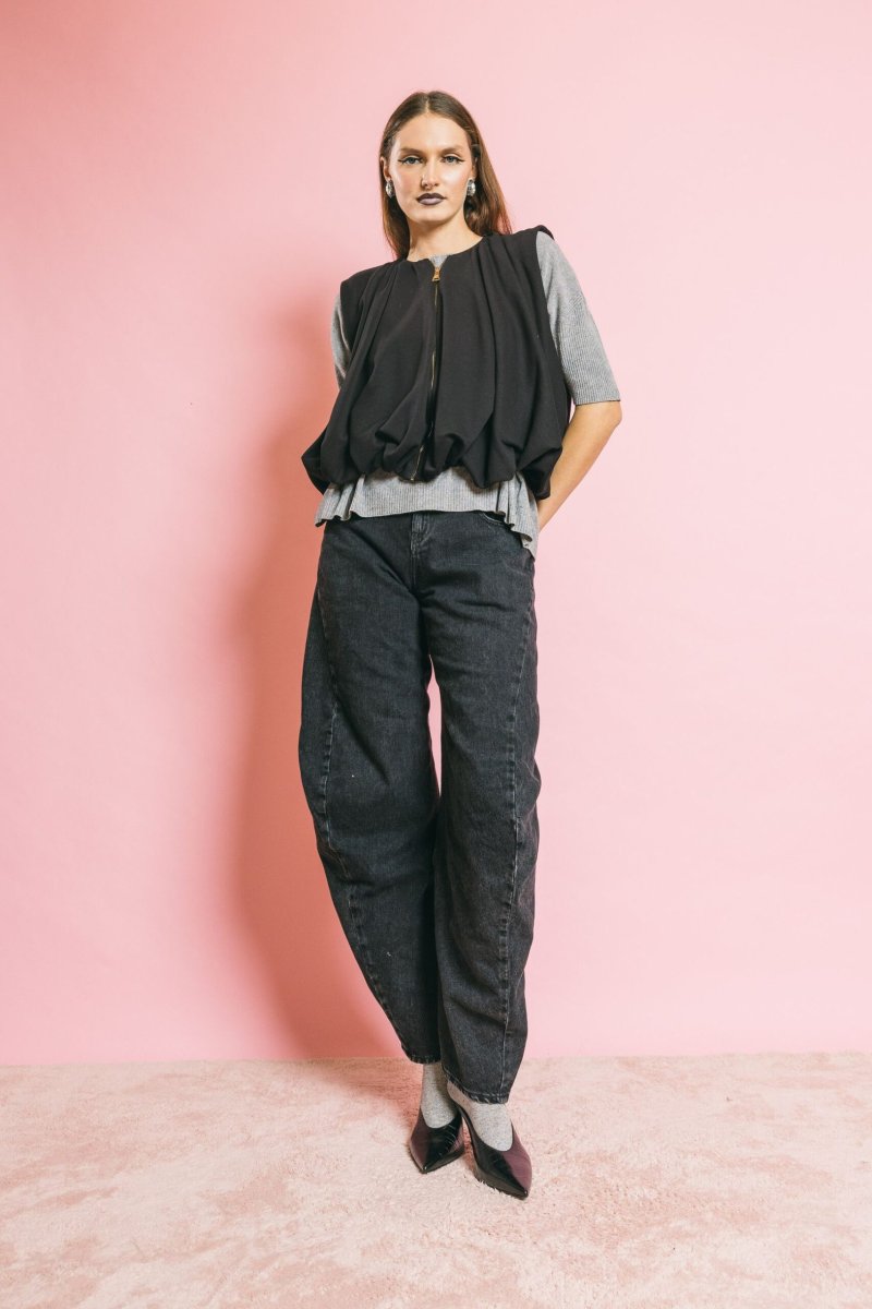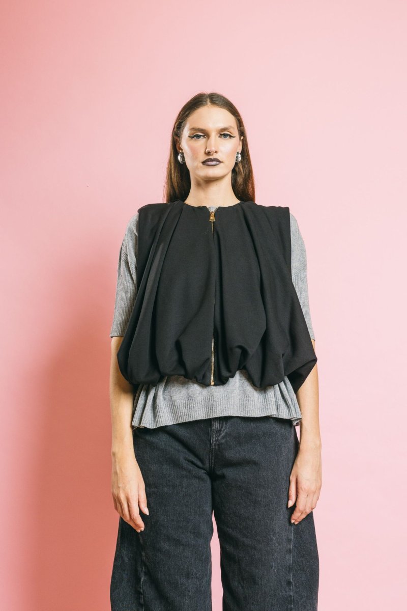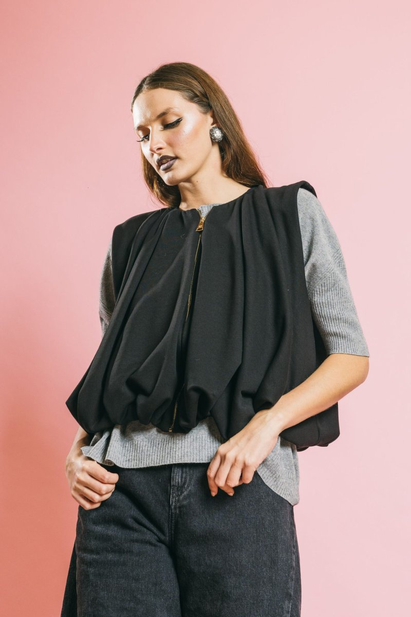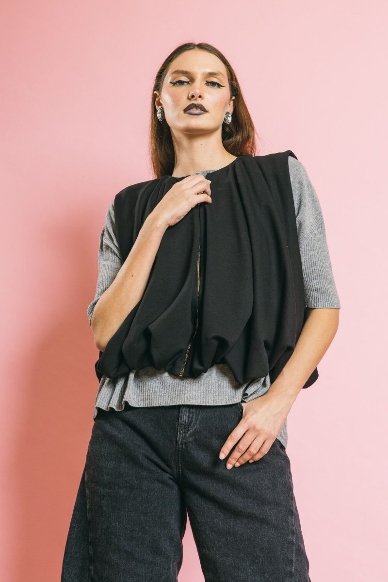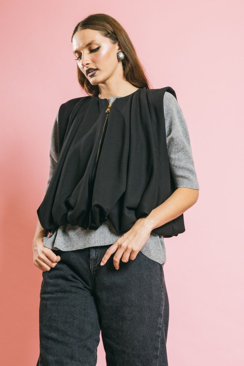 Gilet modello a palloncino, dettaglio zip pro a vista e elastico sul fondo, tasche invisibili.