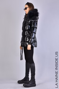 Piumino 3/4 in nylon cangiante – Imbottito 250gr. con ovatta – Foderato con ecopelliccia – Cappuccio over rimovibile con zip – Chiusura zip doppio cursore – tasche