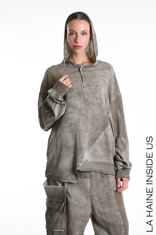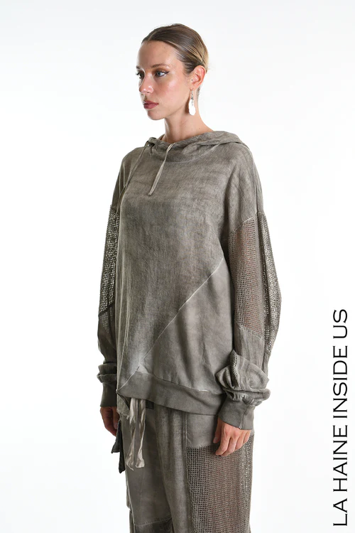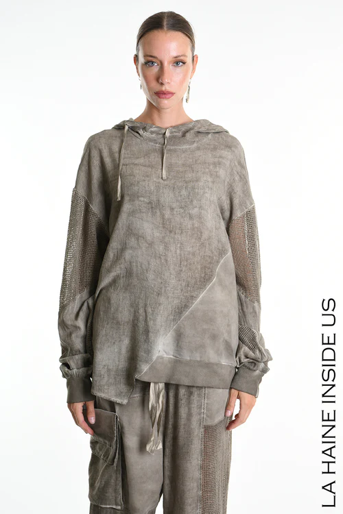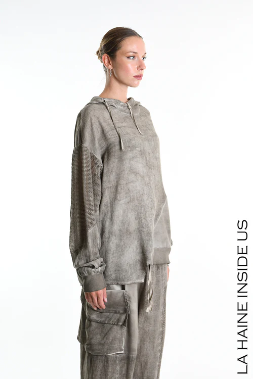 Felpa asimemtrica over in misto lino – Inserti in gabardina e rete tinto freddo – Cappuccio con coulisse