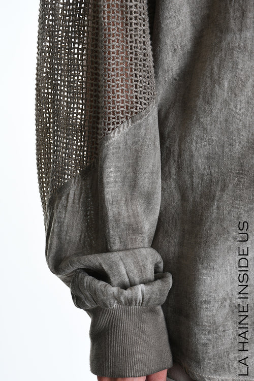 Blend linen over asymmetric sweatshirt – Dyed cold net & gabardina inserts – Hood with coulisse