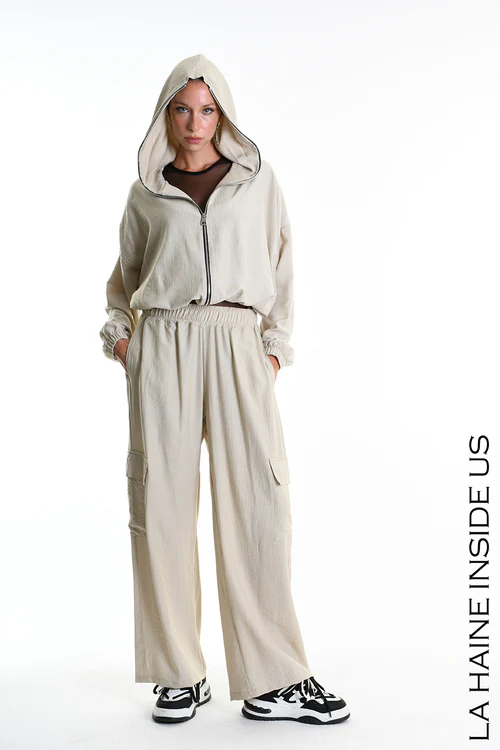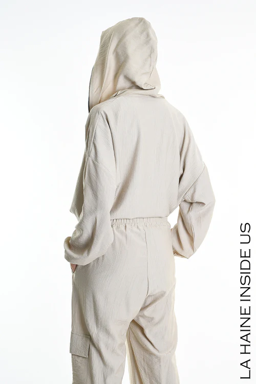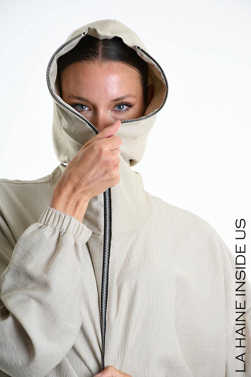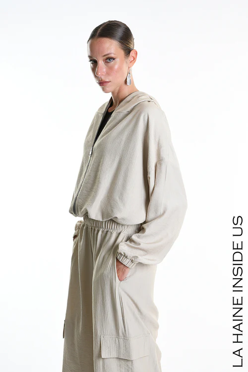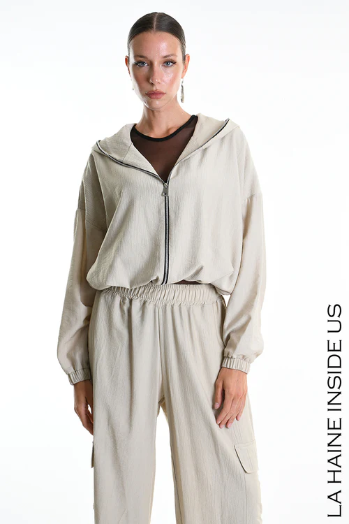 Embossed viscose fluid over bomber – Low crotch – Doubled over hood – Zip closure double slider – Elastic bottom cuffs – Bottom coulisse