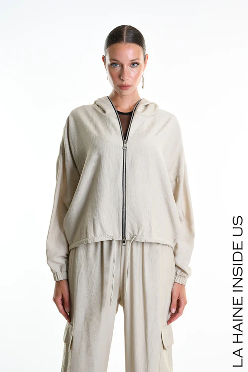 Bomber over in fluido di viscosa goffrata – Cavallo basso – Cappuccio over doppiato – Chiusura zip doppio cursore – Polsi fondo elasticizzati – Coulisse fondo