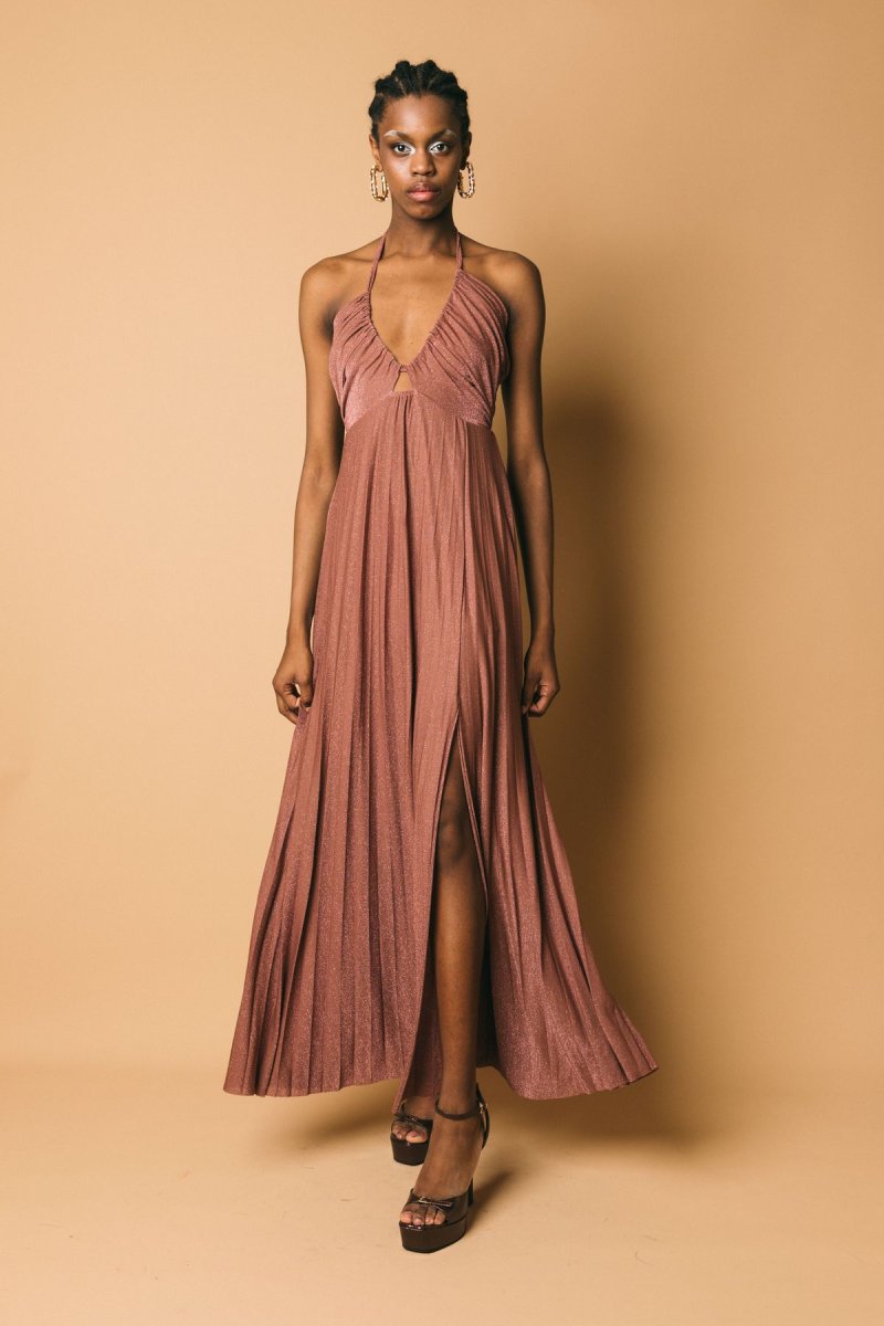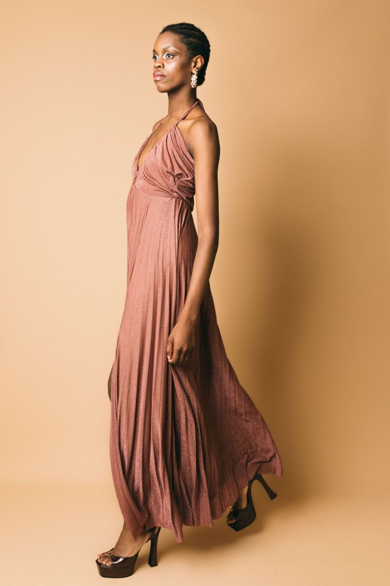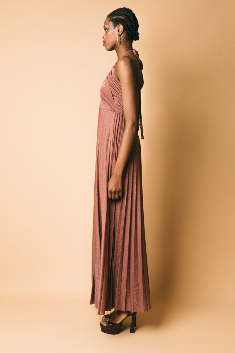 Abito lungo plissè lurex, dettaglio apertura sul davanti, elastico in vita, taglio vivo