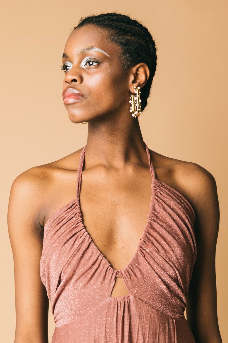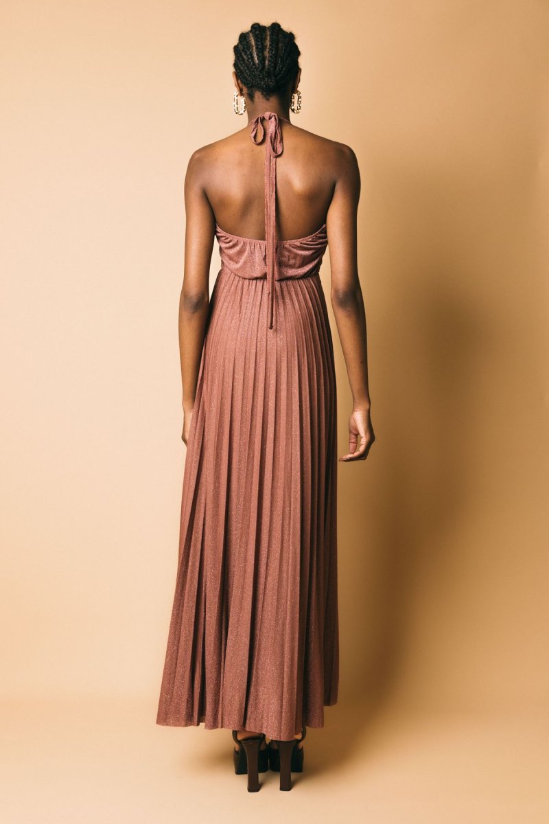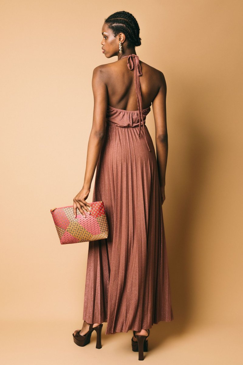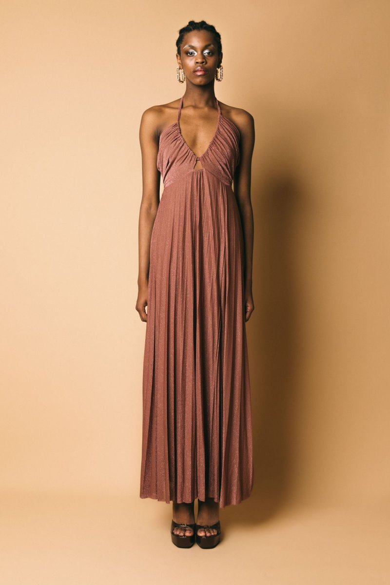 Abito lungo plissè lurex, dettaglio apertura sul davanti, elastico in vita, taglio vivo