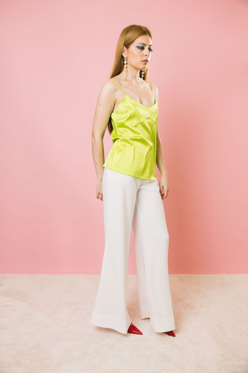 Essenziale e sofisticato, questo top in raso di seta si distingue per la sua eleganza senza tempo e la straordinaria versatilità. il design minimal è impreziosito da sottilissime bretelle che esaltano la femminilità e da una delicata sciancratura sotto il seno, che dona armonia alla silhouette senza costringerla. La vestibilità morbida e il luminoso verde acido aggiungono un tocco di carattere, rendendolo perfetto sia per i look eleganti che per outfit più casual. Ideale sotto una giacca per un’eleganza discreta, impeccabile con un paio di jeans per un tocco di raffinatezza nel quotidiano. Un capo trasversale, adatto ad ogni occasione, dal giorno alla sera.