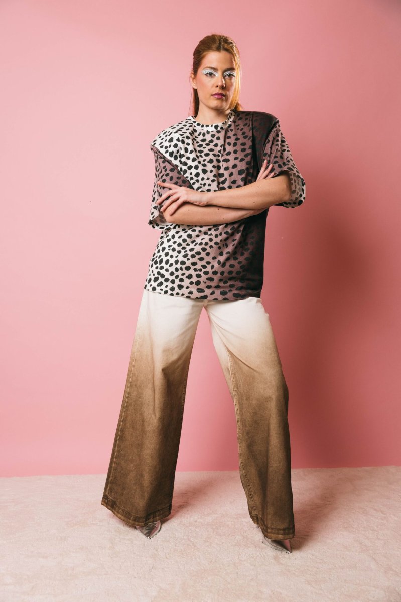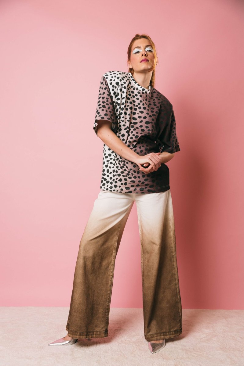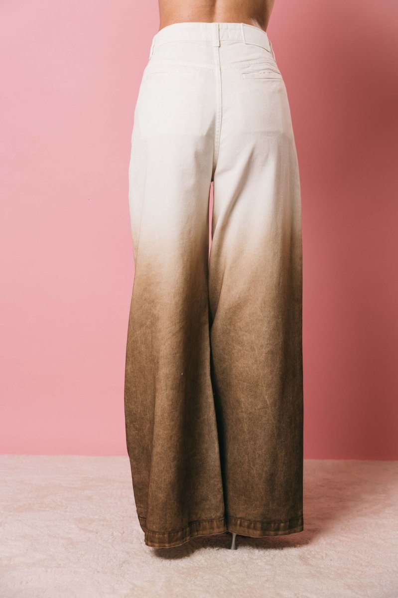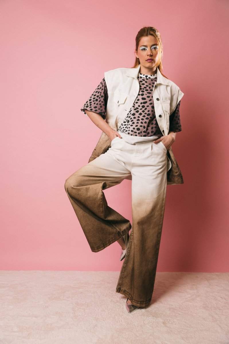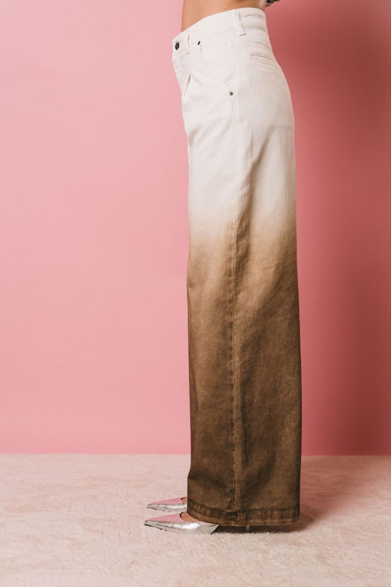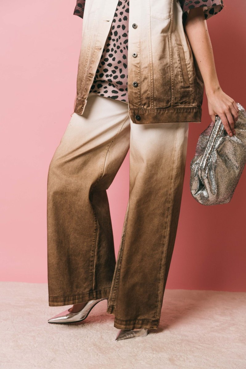 Questo jeans modello palazzo, con gamba leggermente svasa, presenta un effetto sfumato che sfiora il latte nella parte superiore, il colore dattero nella parte sottostante. il dettaglio delle pences aggiunge un tocco distintivo, facendo di questo modello una scelta comoda, confortevole e stilosa.