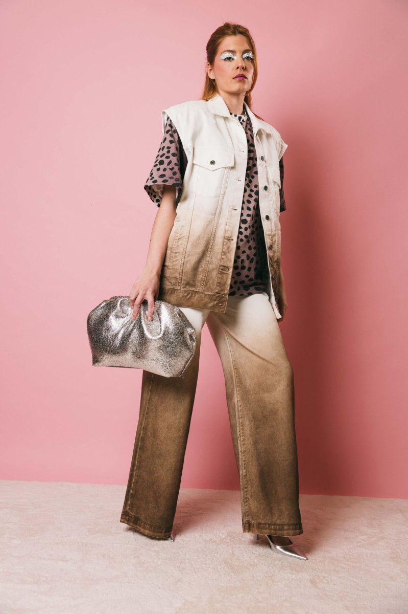 Questo jeans modello palazzo, con gamba leggermente svasa, presenta un effetto sfumato che sfiora il latte nella parte superiore, il colore dattero nella parte sottostante. il dettaglio delle pences aggiunge un tocco distintivo, facendo di questo modello una scelta comoda, confortevole e stilosa. *La modella è alta 178 cm e indossa la taglia 38 * Fit comfy Tessuto: 100% cotone Istruzioni per il lavaggio: Lavabile in acqua