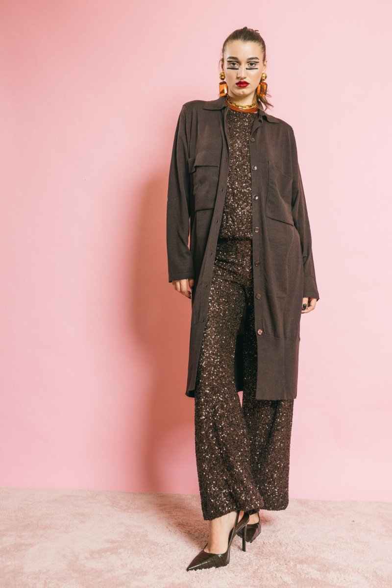 Cardigan lungo in lana e seta, con chiusura a bottoni, tasche a vista, colletto polo e spacchetti laterali. Un capo femminile e trasversale, che coniuga comfort e raffinatezza, pensato per accompagnare con naturale eleganza ogni momento della giornata.