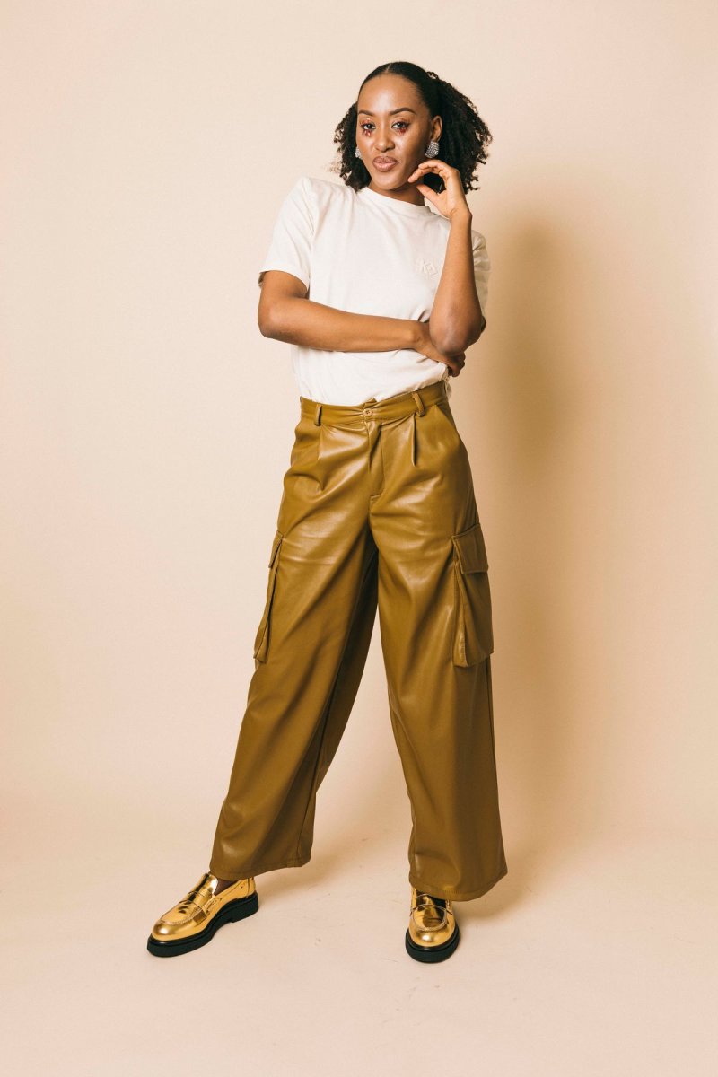 Pantalone cargo in ecopelle full lenght morbido con tasche laterali applicate Misura indossata in foto: S Altezza modella:1.81 m