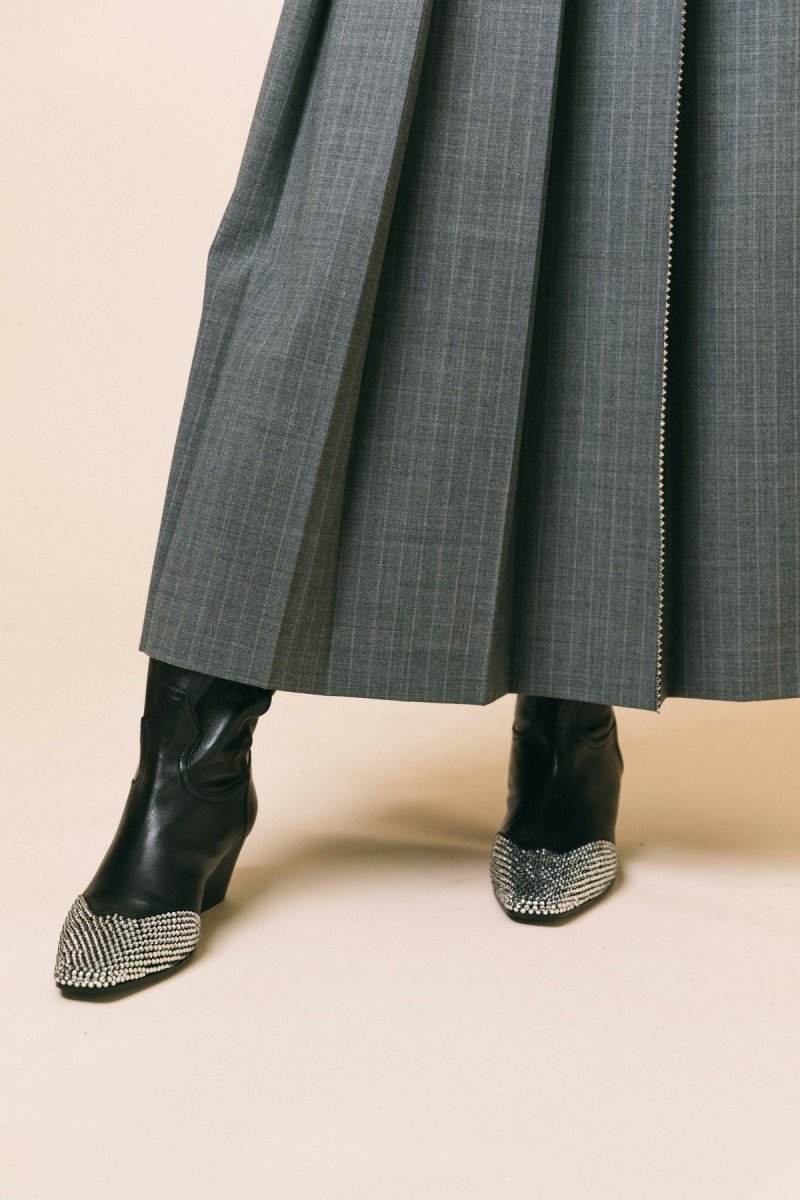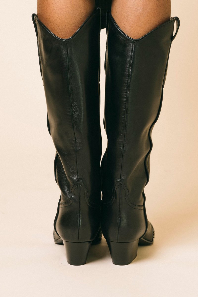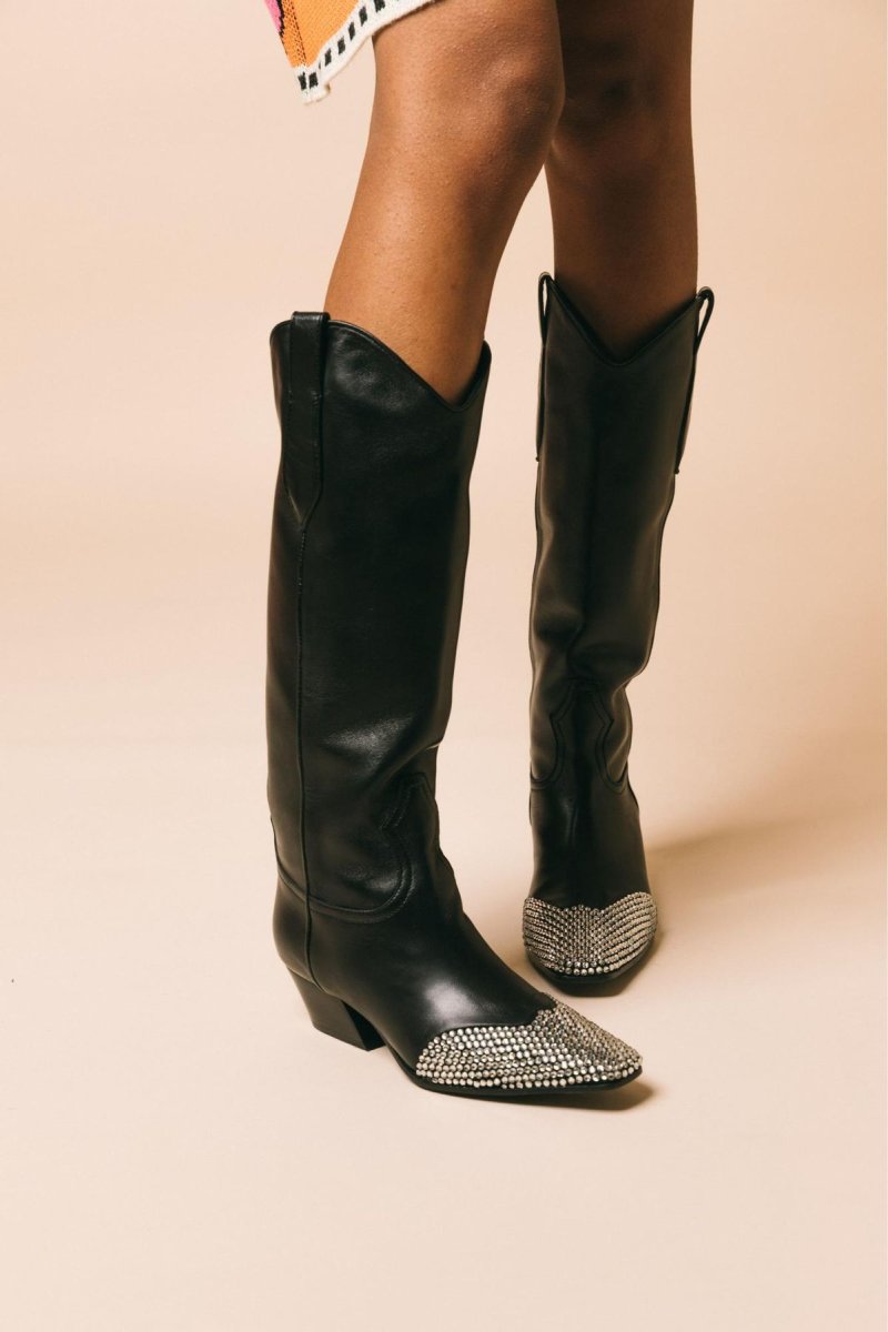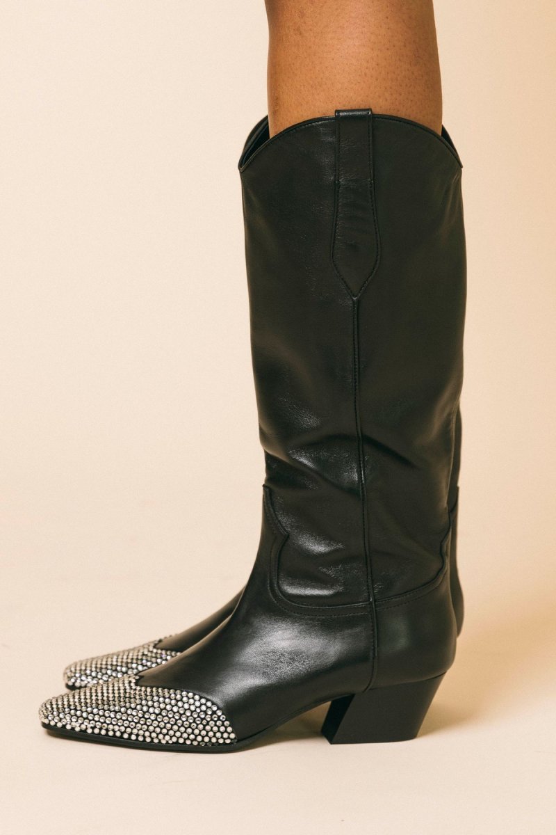 Texano in pelle di vitello Punta quadrata Applicazioni Swarosky, doppio tirante Tacco largo Altezza tacco 50 mm Altezza del gambale 390 mm Suola in cuoio e gomma Made in Italy