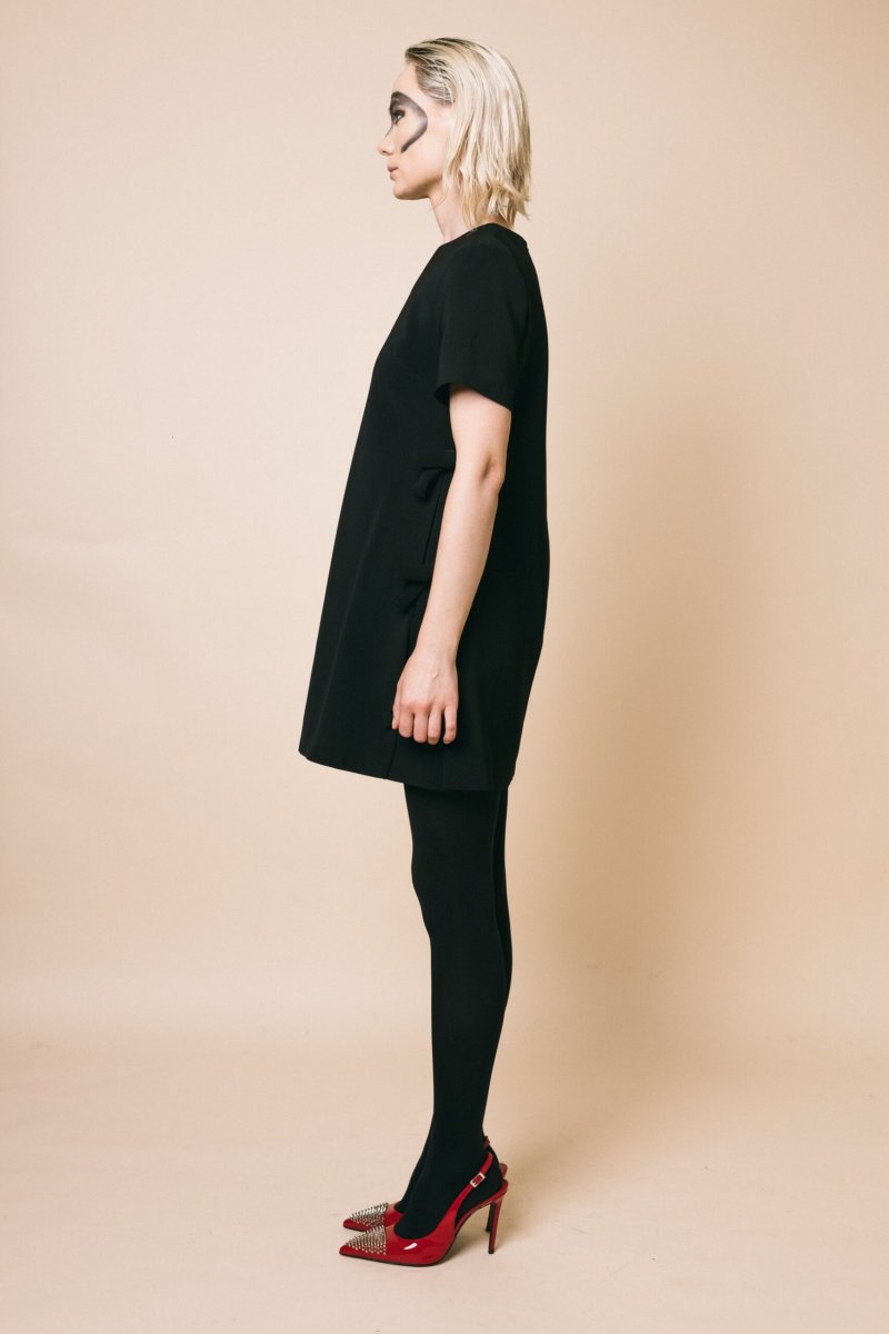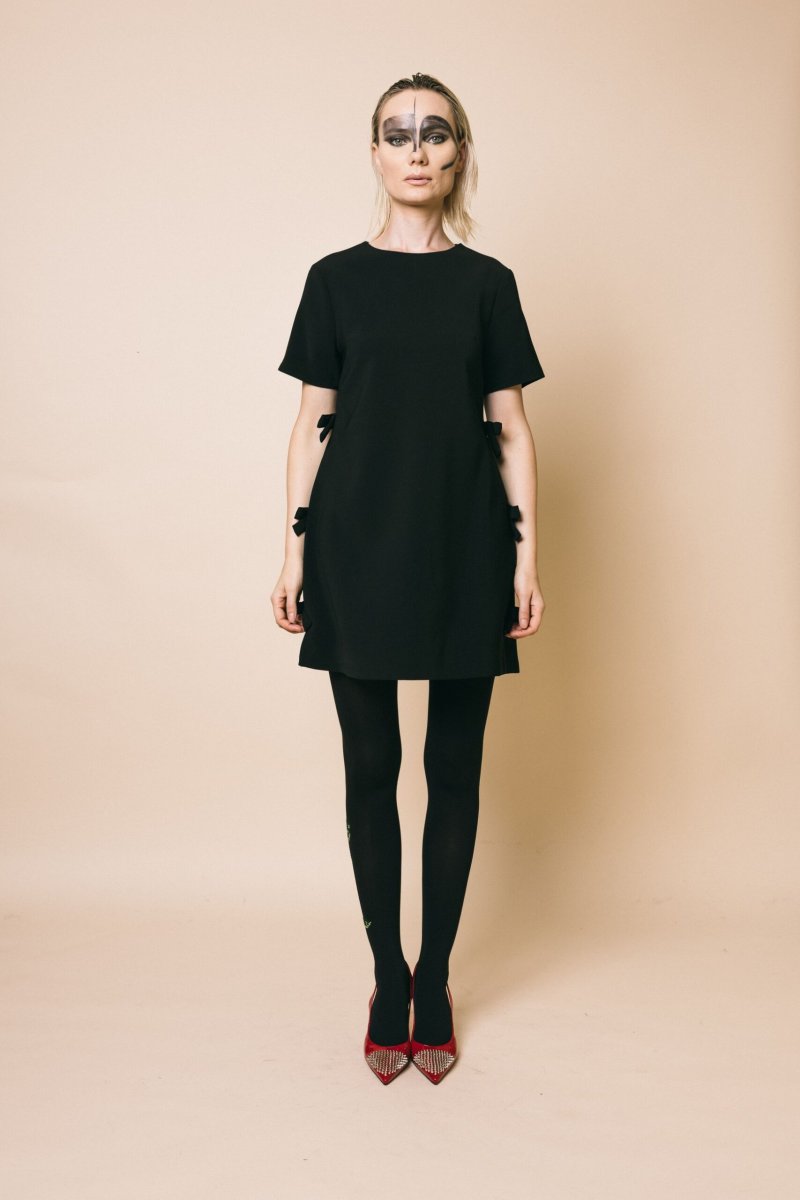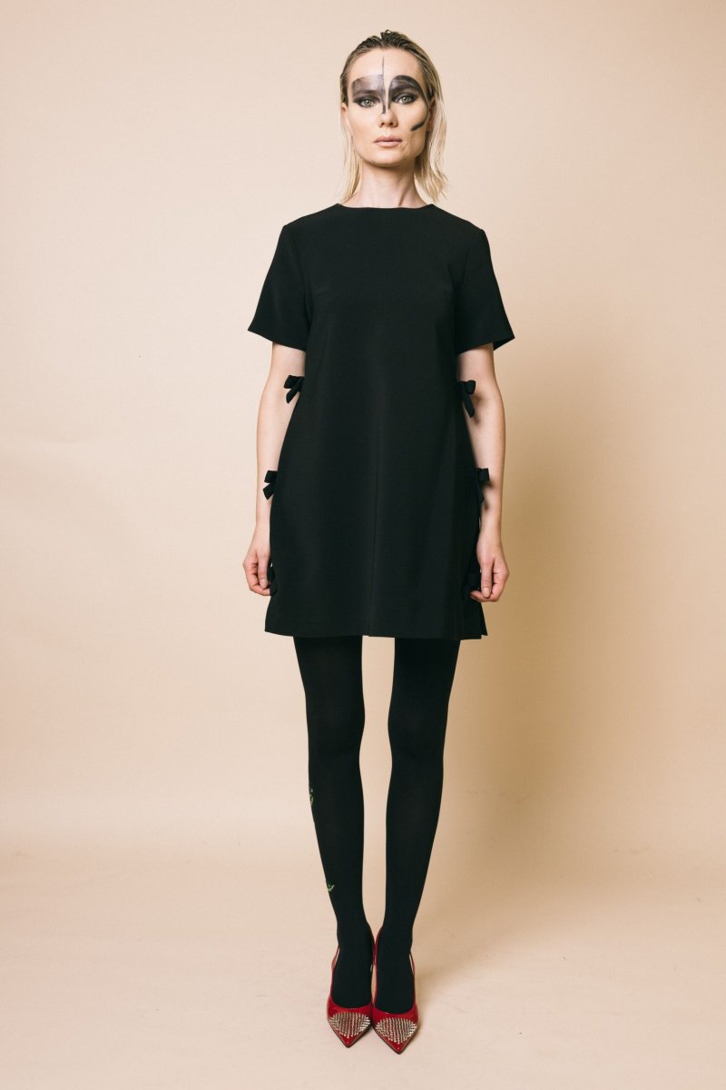 Mini abito svasato, mezza manica, dettaglio fiocchi applicati sui fianchi, chiusura con zip invisibile sul retro