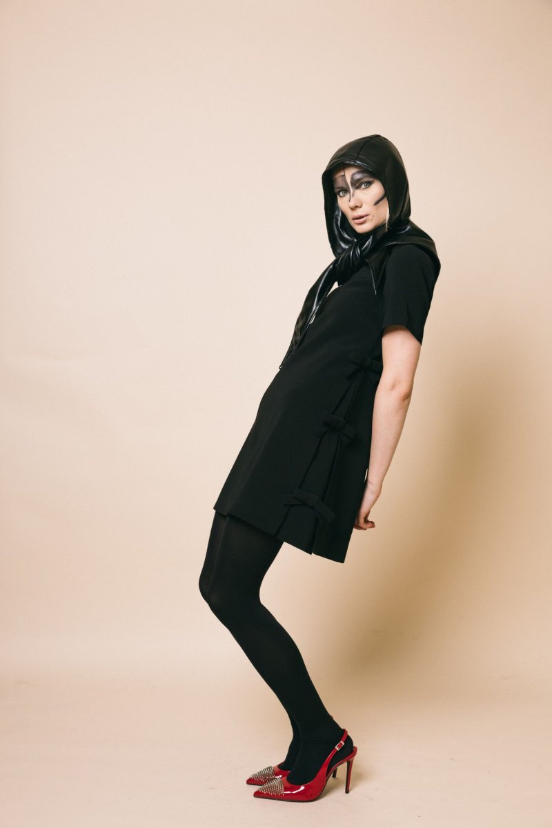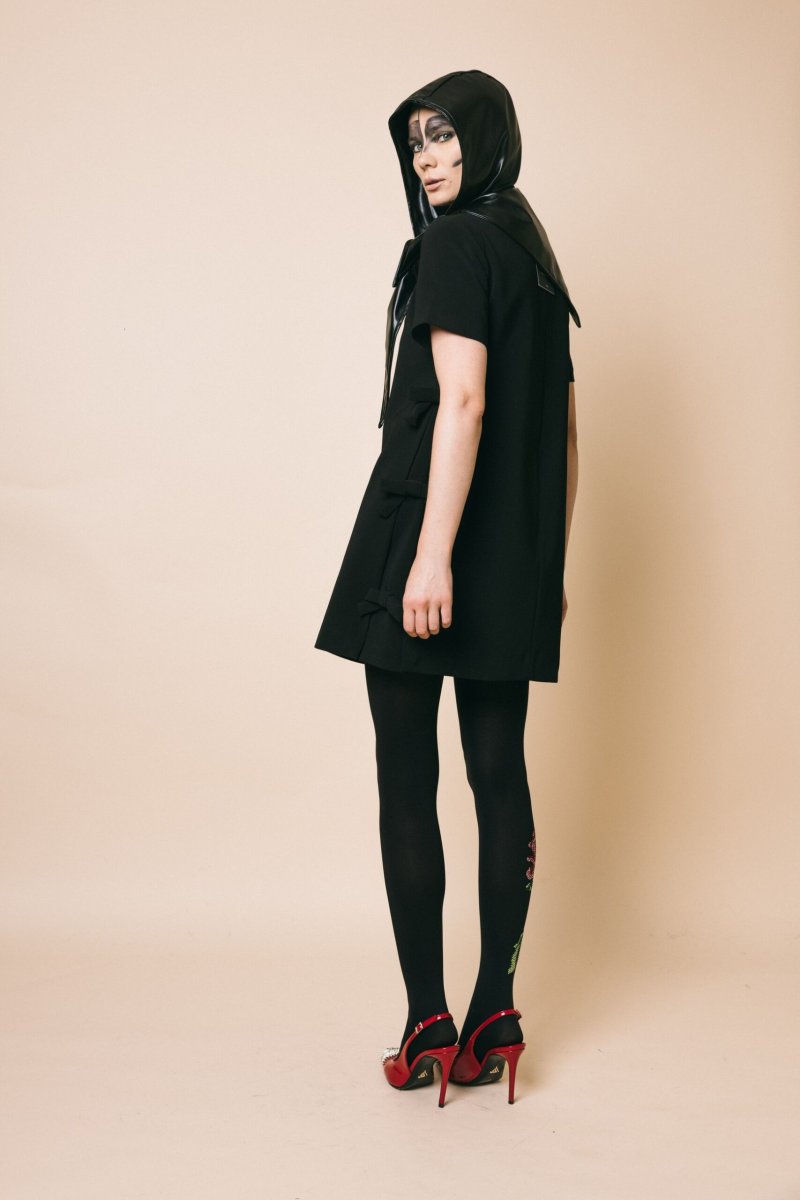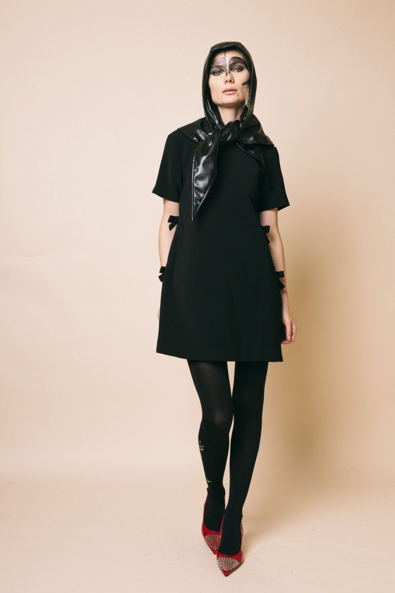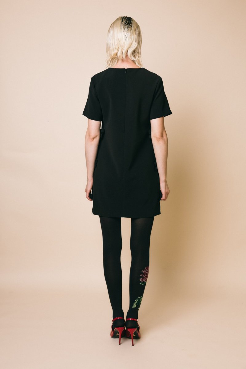 Mini abito svasato, mezza manica, dettaglio fiocchi applicati sui fianchi, chiusura con zip invisibile sul retro