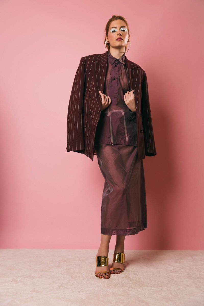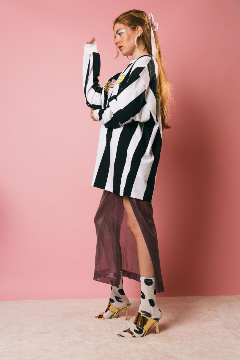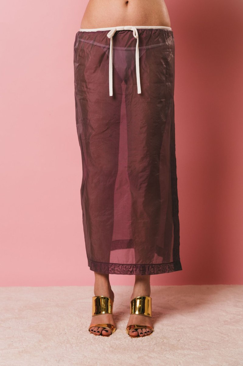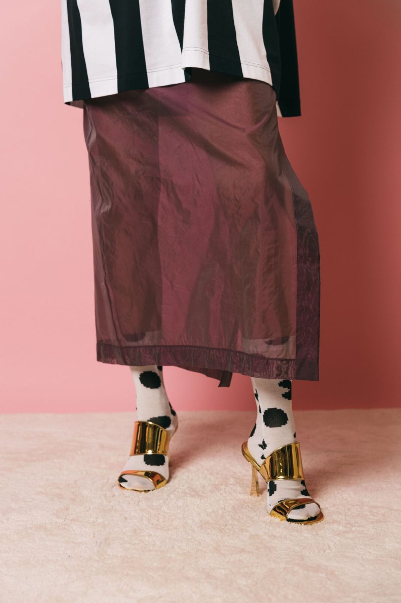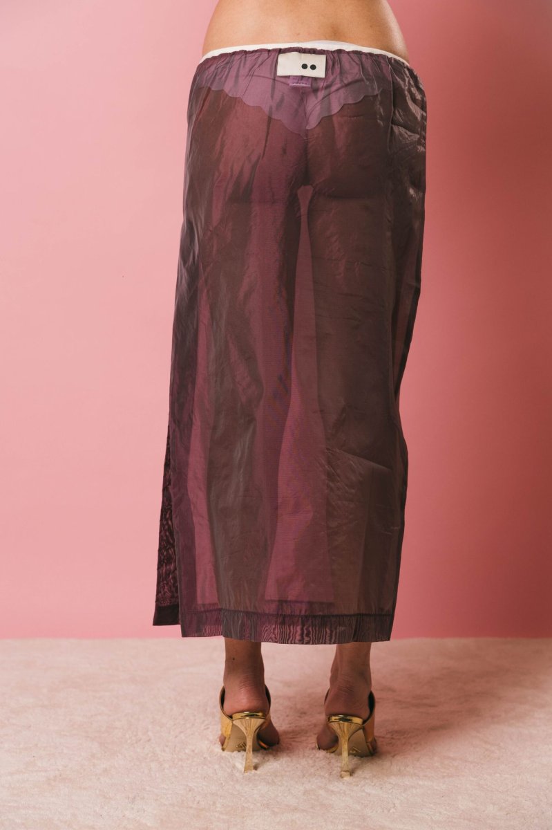 Gonna midi in organza non elasticizzata, con spacco laterale e elastico in vita decorato da fiocco a contrasto latte. Un capo raffinato e delicato, arricchito dall’etichetta logo sul retro.