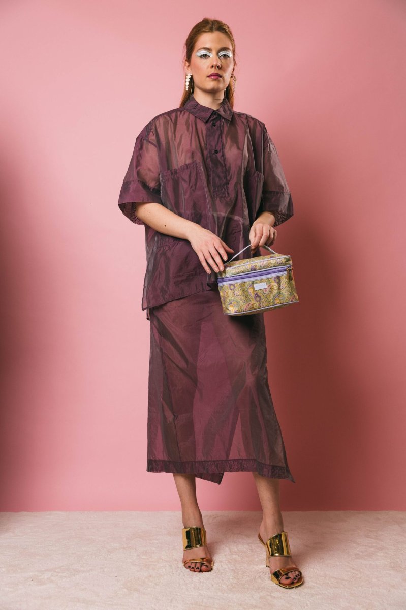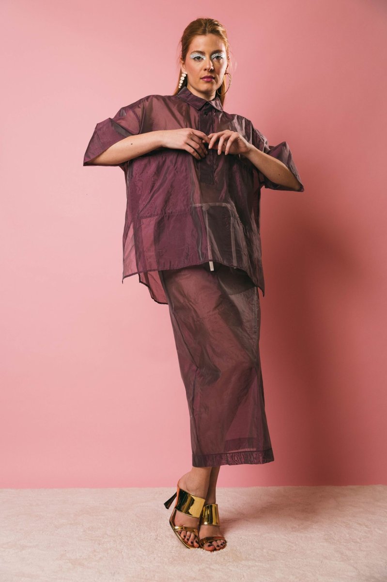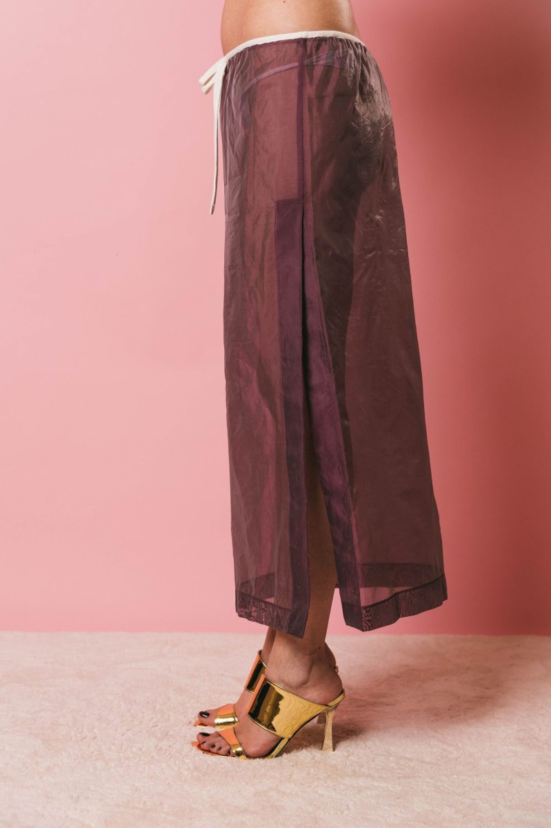 Gonna midi in organza non elasticizzata, con spacco laterale e elastico in vita decorato da fiocco a contrasto latte. Un capo raffinato e delicato, arricchito dall’etichetta logo sul retro. *La modella è alta 179 cm e indossa la taglia XS Tessuto: 100% poliestere Indicazioni di lavaggio: Lavabile a secco delicato