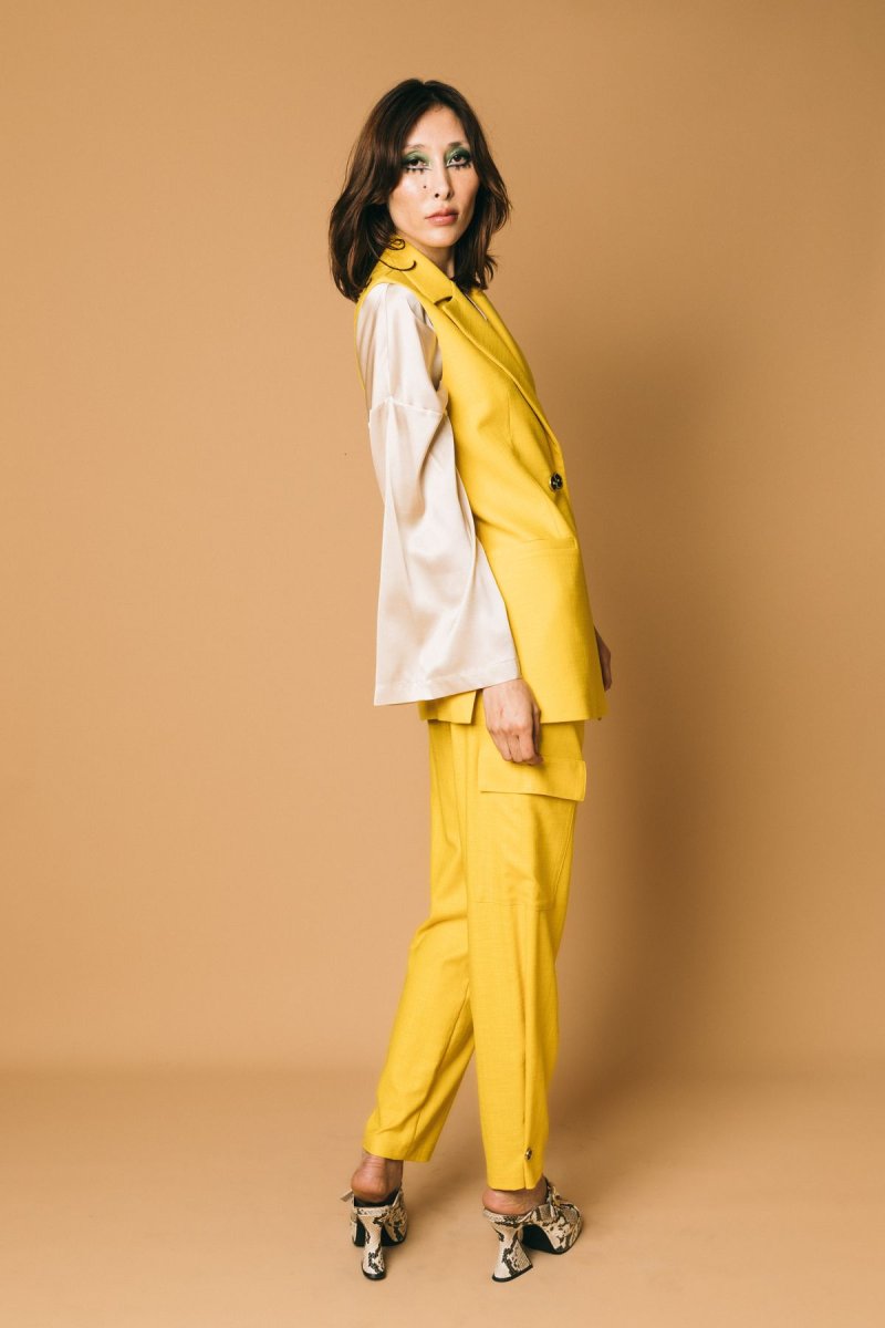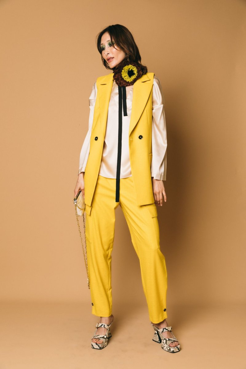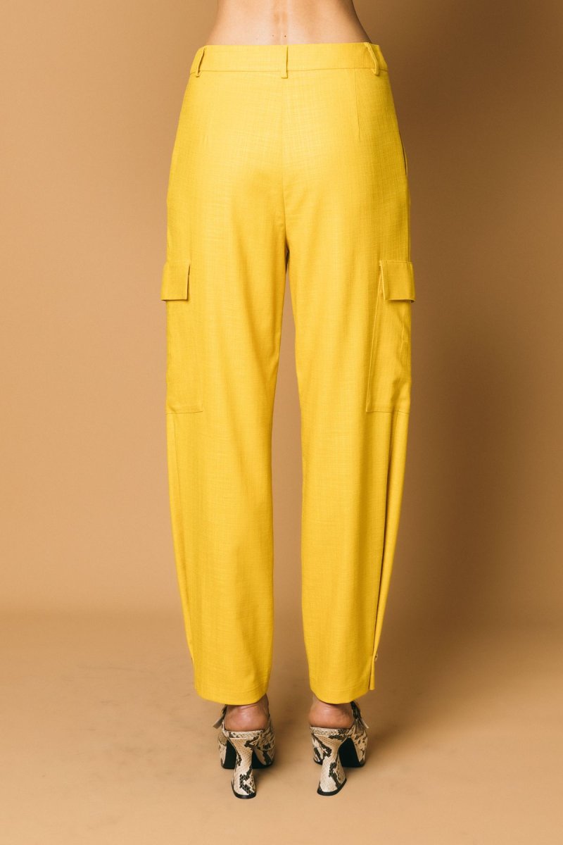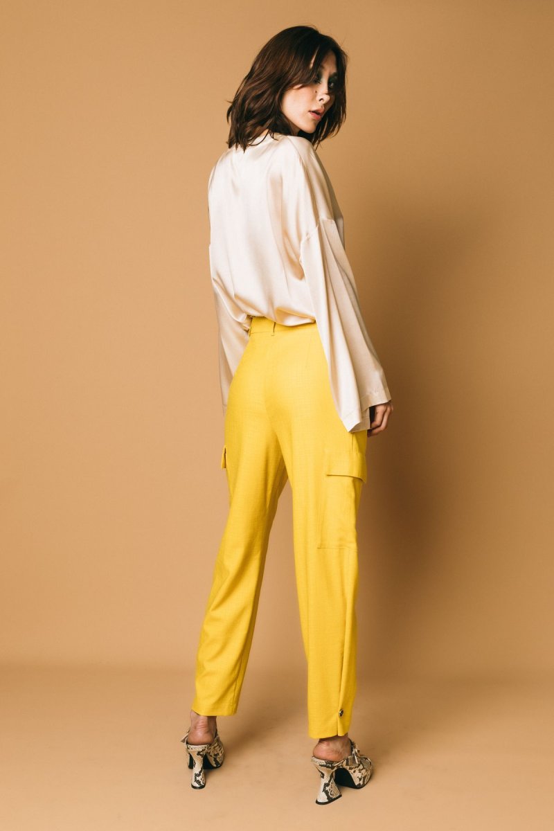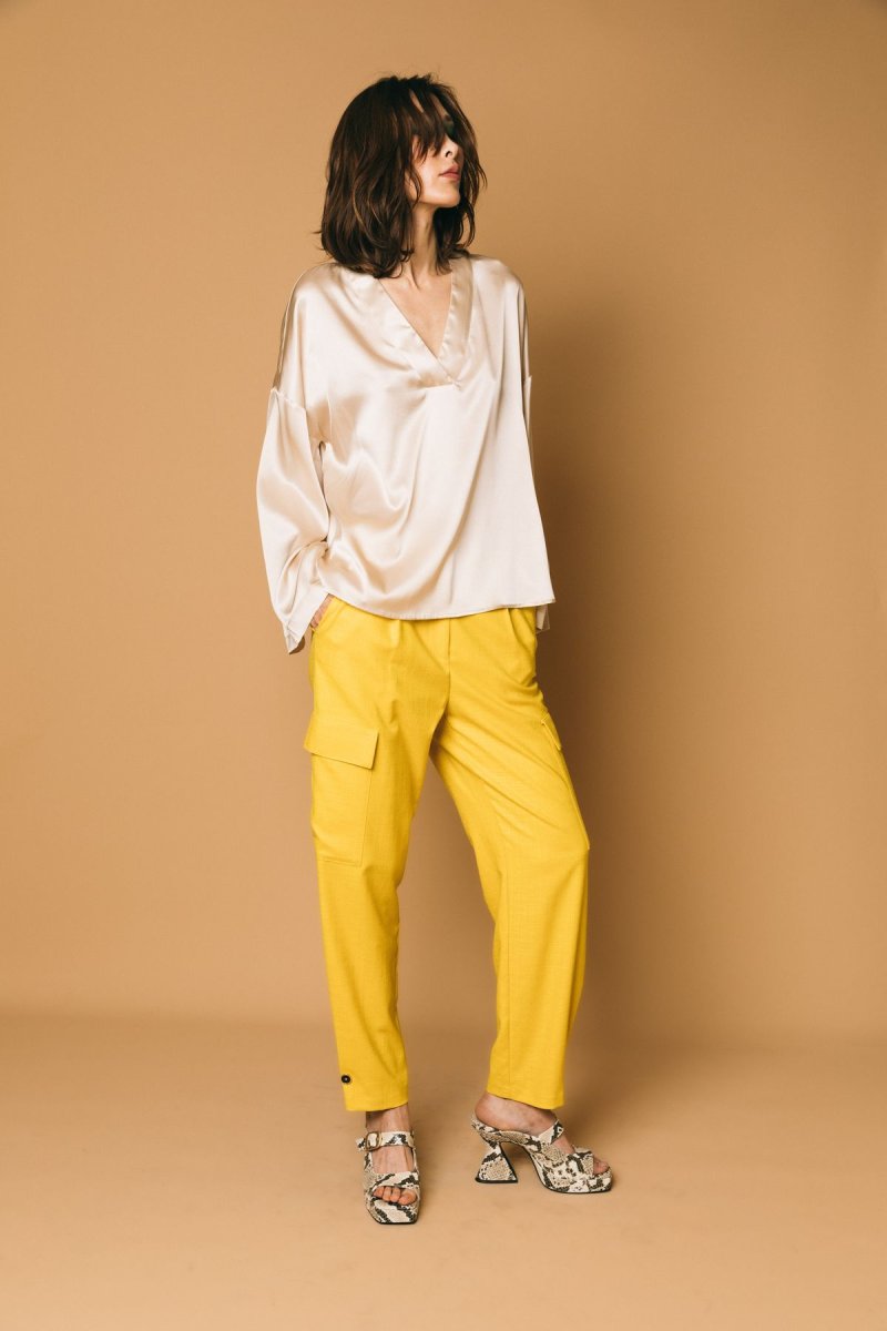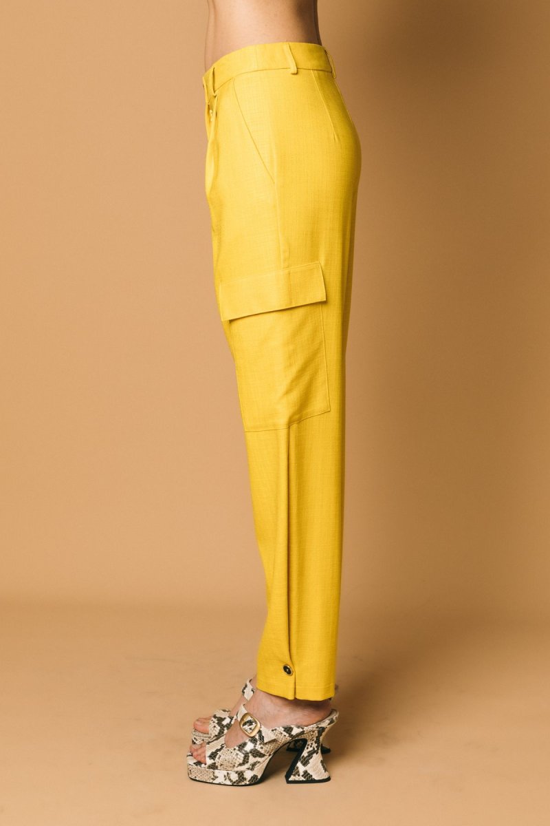 Pantalone cargo con pences, in tessuto destrutturato, dettaglio bottone sul fondo
