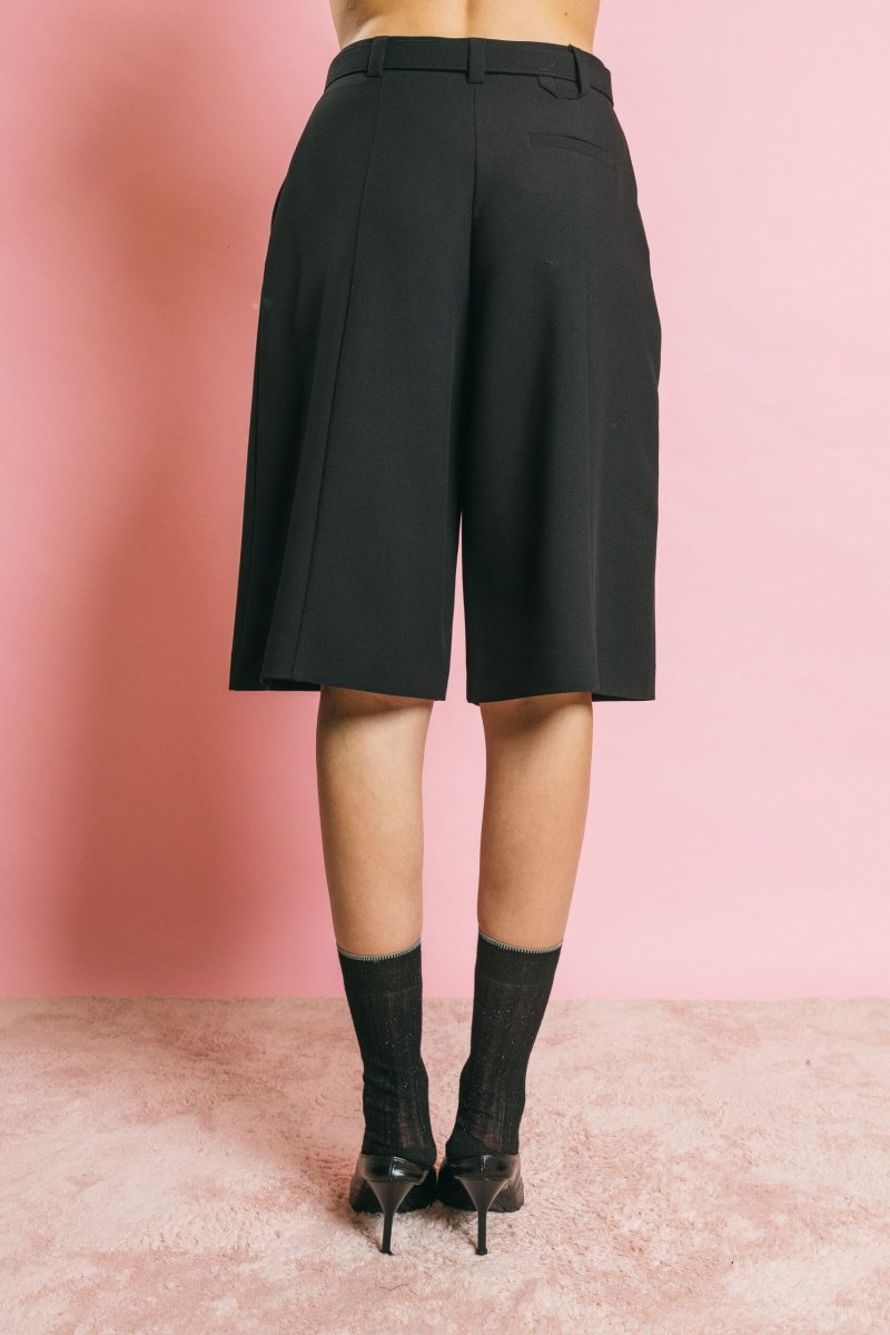 Bermuda in crêpe dal taglio pants, con cintura in vita e tasche laterali anteriori. Le freccette a tasca sul retro richiamano la precisione sartoriale del capo, mentre la zip frontale, il bottone interno e la chiusura a gancio assicurano vestibilità perfetta e comfort. Un modello di estrema versatilità, femminile e raffinato, capace di completare con eleganza e stile una molteplicità di outfit.