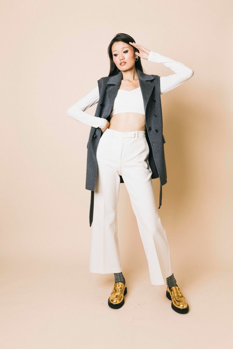 Pantalone leggera trombetta in policotone elasticizzato, vita alta Misura indossata in foto: 40 Altezza modella:1.77