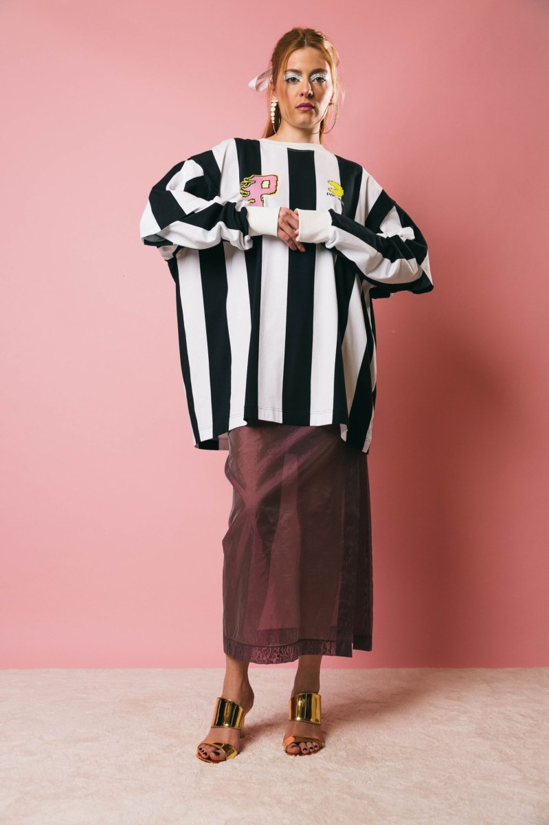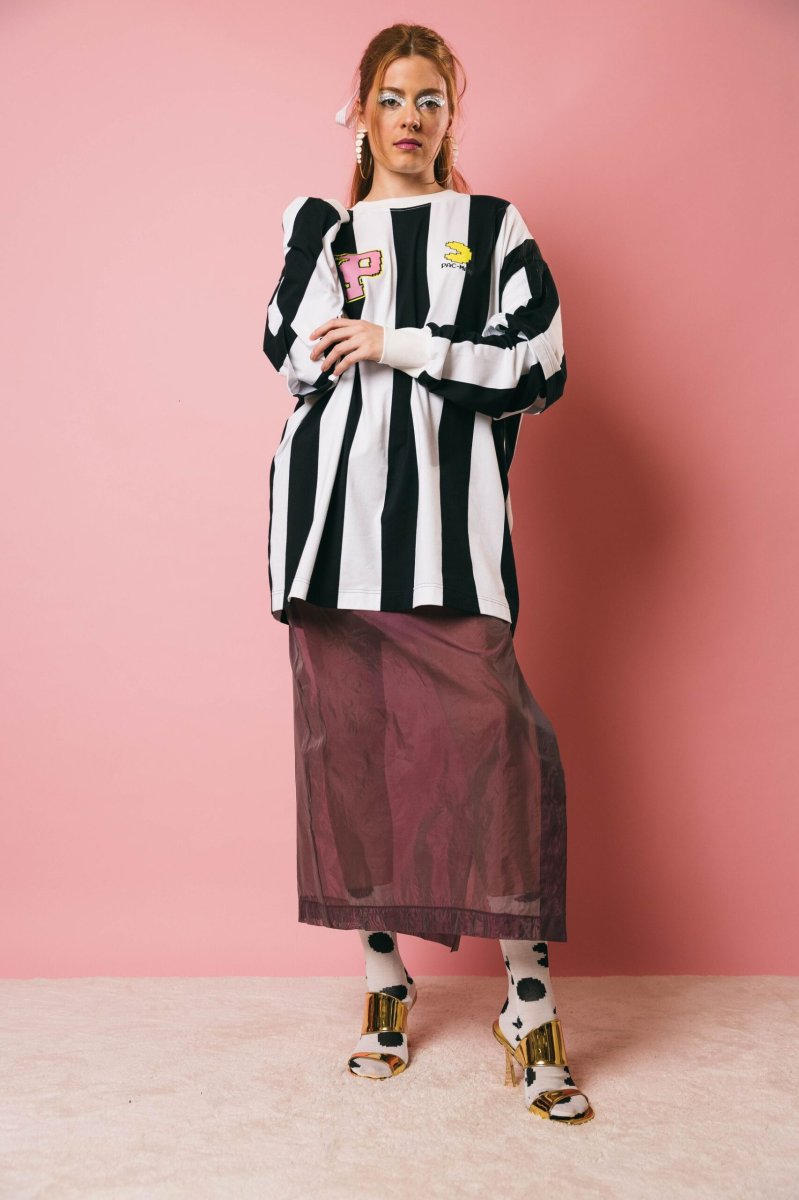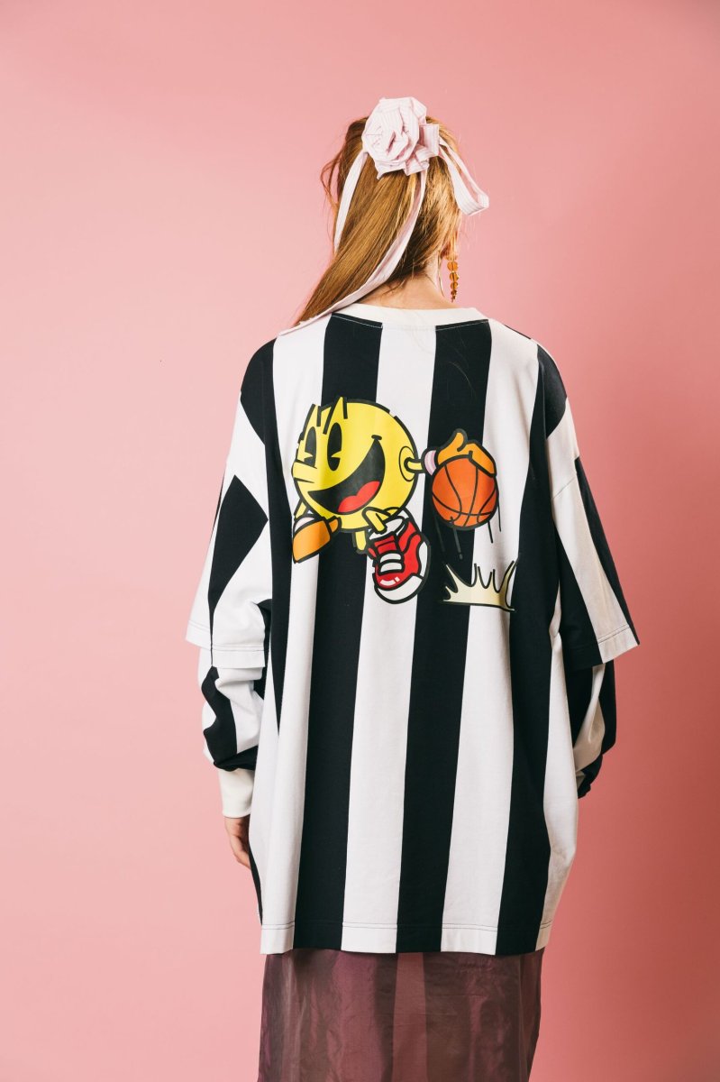 T-shirt over a manica lunga, ispirata modello basket, realizzata in puro cotone motivo a righe bianco e nero, caratterizzata da un design ampio e dalla stampa Pac-Man a contrasto, presenta un girocollo classico. La costruzione a doppio strato crea un particolare effetto mezza manica ampia, con la manica lunga che fuoriesce, completato da polsini per un fit equilibrato. Un capo che unisce comfort e stile contemporaneo.