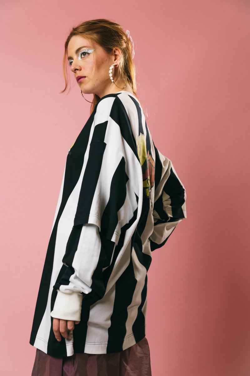 T-shirt over a manica lunga, ispirata modello basket, realizzata in puro cotone motivo a righe bianco e nero, caratterizzata da un design ampio e dalla stampa Pac-Man a contrasto, presenta un girocollo classico. La costruzione a doppio strato crea un particolare effetto mezza manica ampia, con la manica lunga che fuoriesce, completato da polsini per un fit equilibrato. Un capo che unisce comfort e stile contemporaneo. Altezza modella:1.78 cm Taglia indossata in foto: M/L *Oversize fit 100% cotone Lavabile in lavatrice 30′