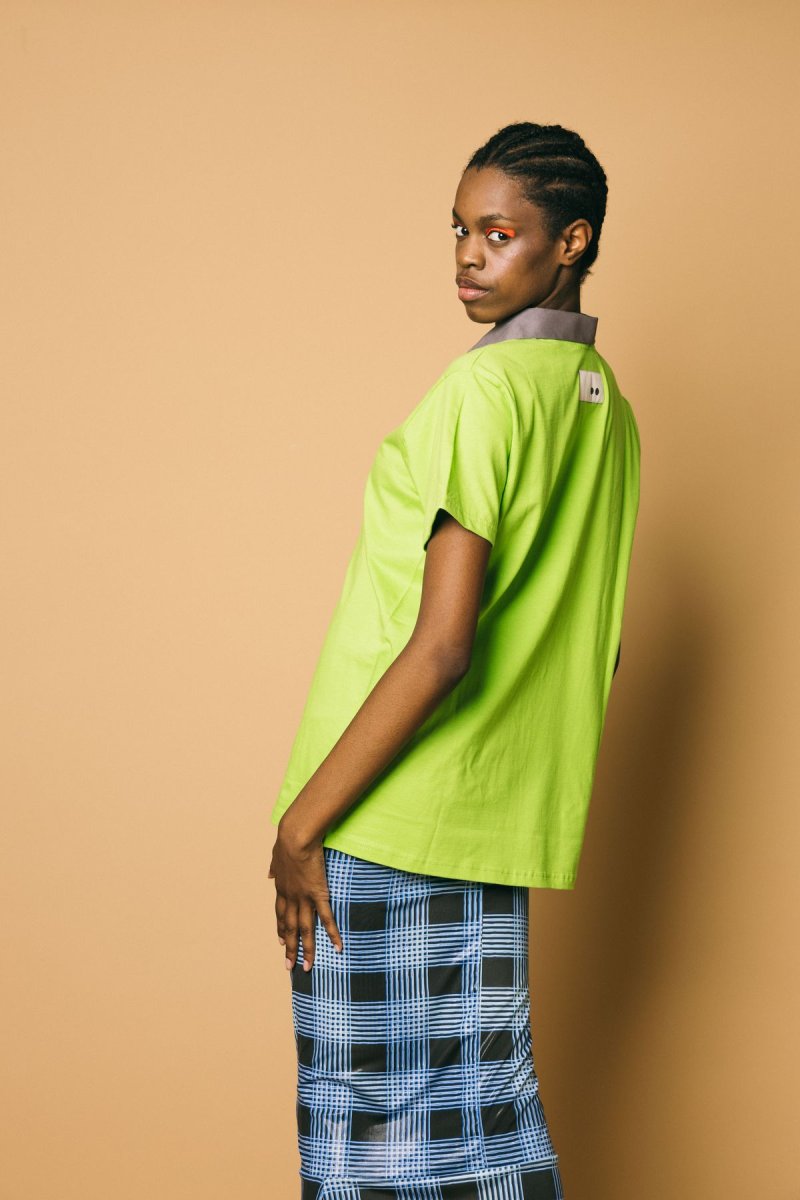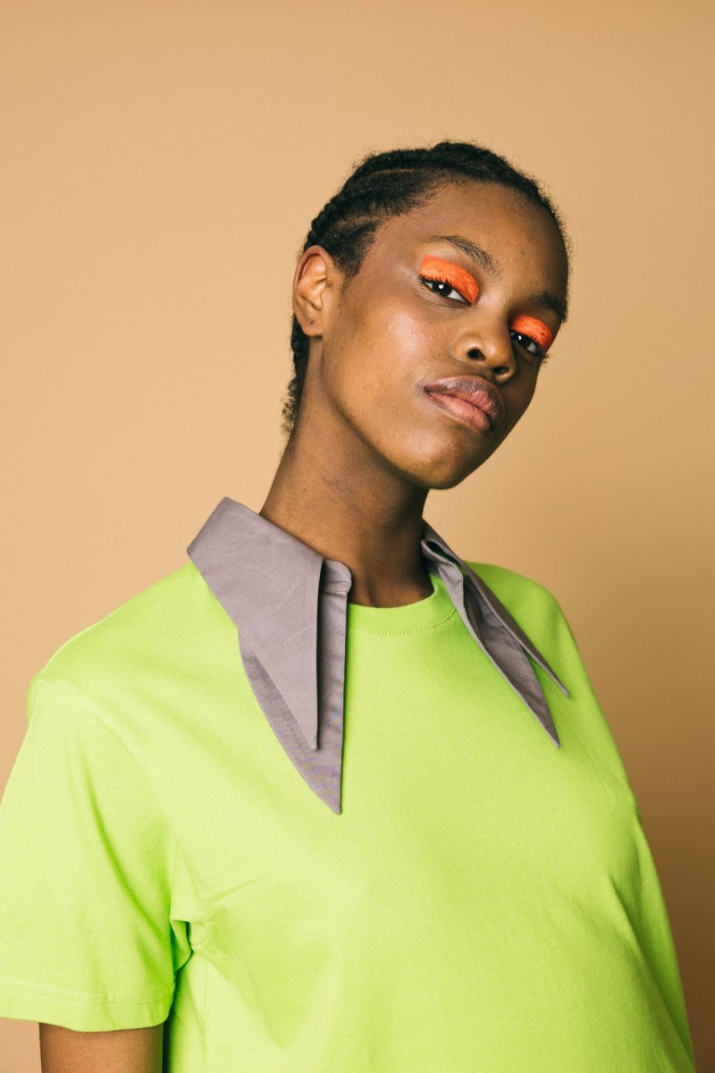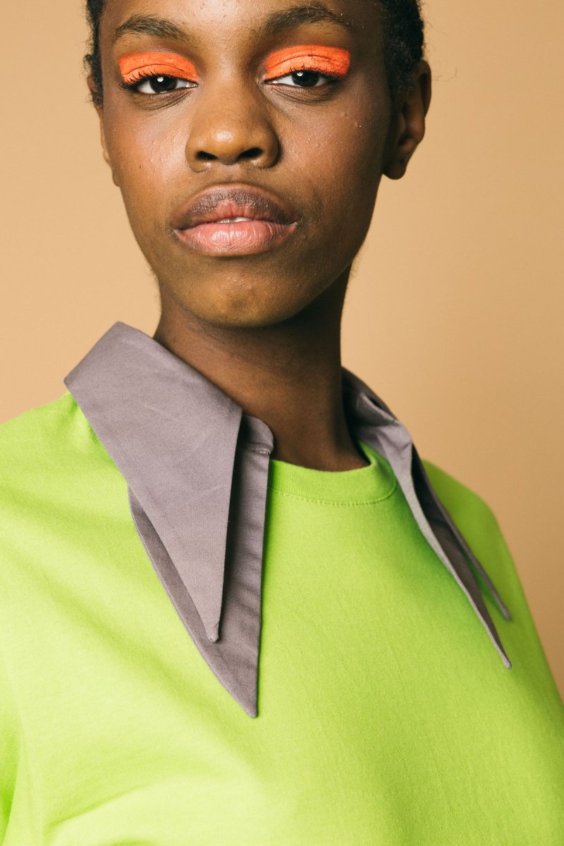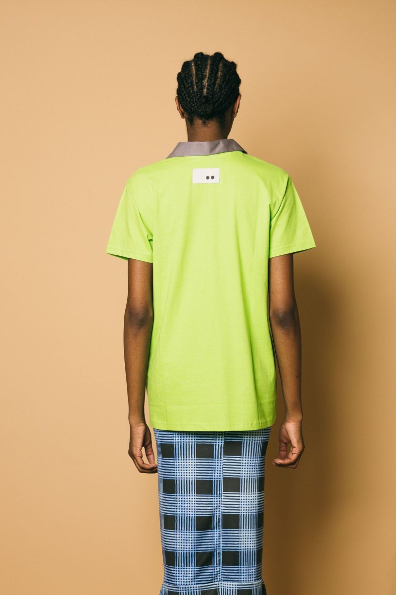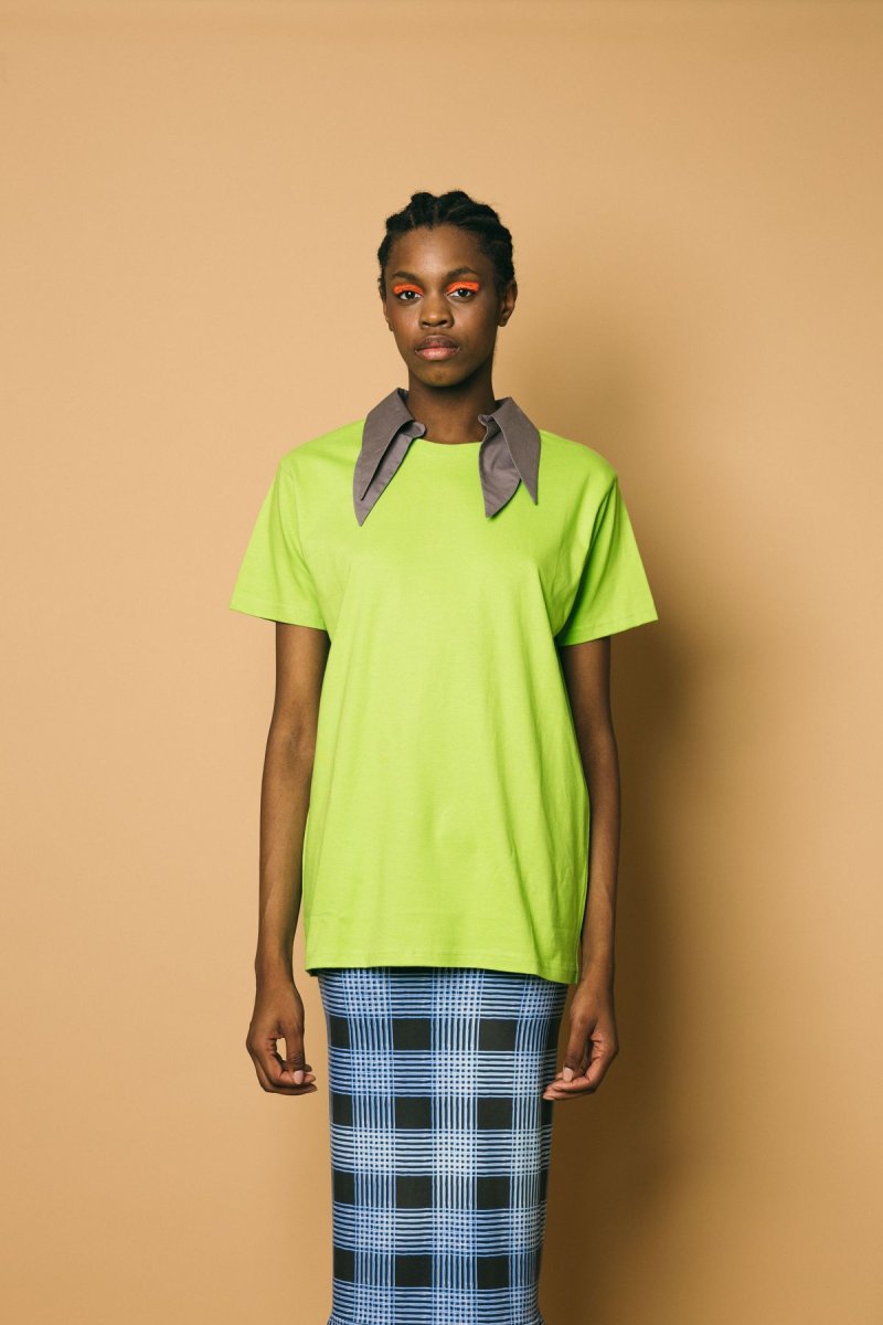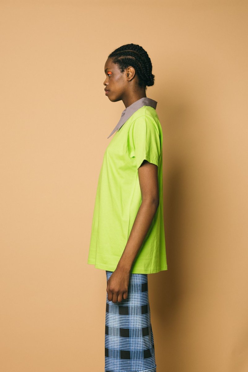 T-shirt in cotone con collo camicia a punta removibile Volume morbido, leggermente oversize Altezza modella:1.81 cm Taglia indossata: S Composizione: 100% poliestere Lavabile a secco