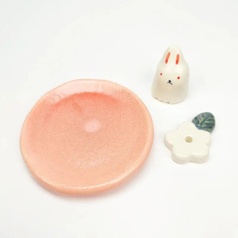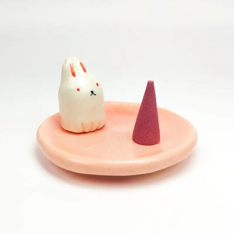 Un adorabile porta-incenso giapponese in ceramica con una statuetta di coniglio e un fiore di ciliegio. Oggetto decorativo kawaii, questo porta-incenso aggiunge un tocco di fascino giapponese al vostro rituale di meditazione.