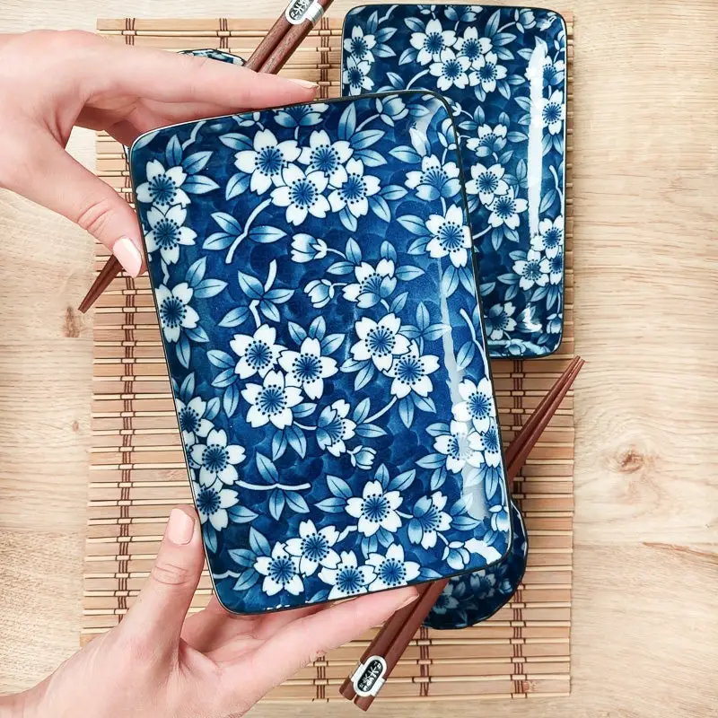 Gli amanti della cucina giapponese si innamoreranno di questo elegante set di stoviglie per sushi. Il set splendidamente decorato con fiori di ciliegio comprende due piatti rettangolari, due ciotoline per le salse e due paia di bacchette giapponesi.