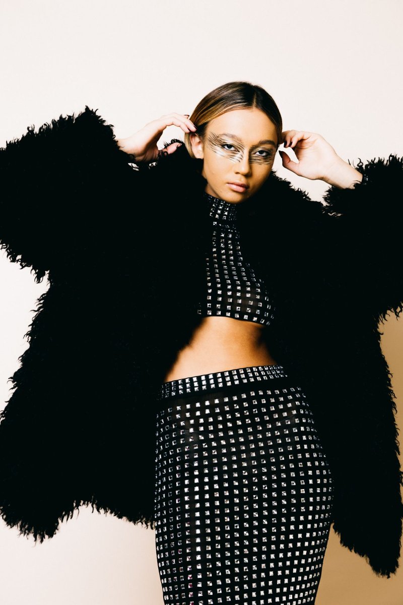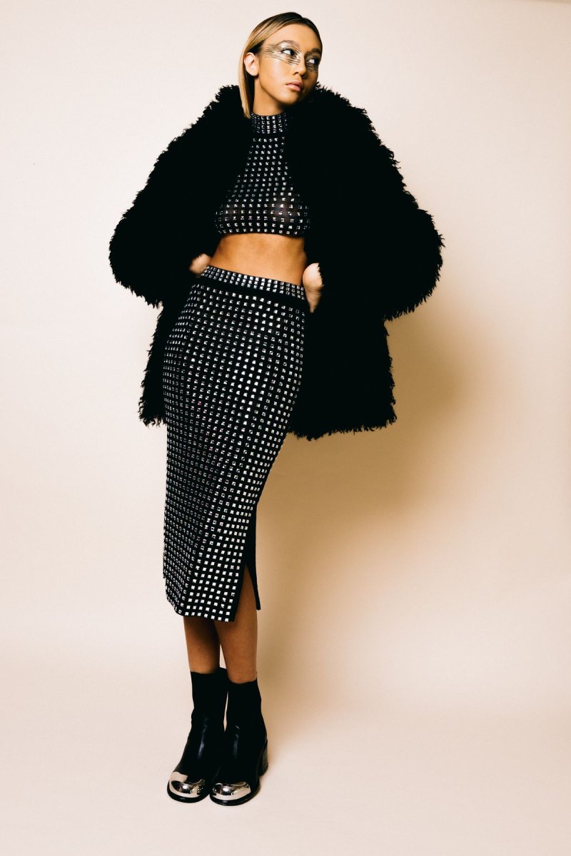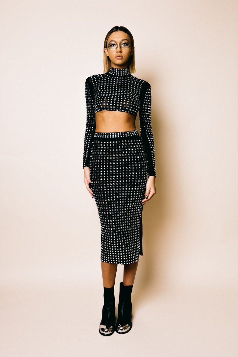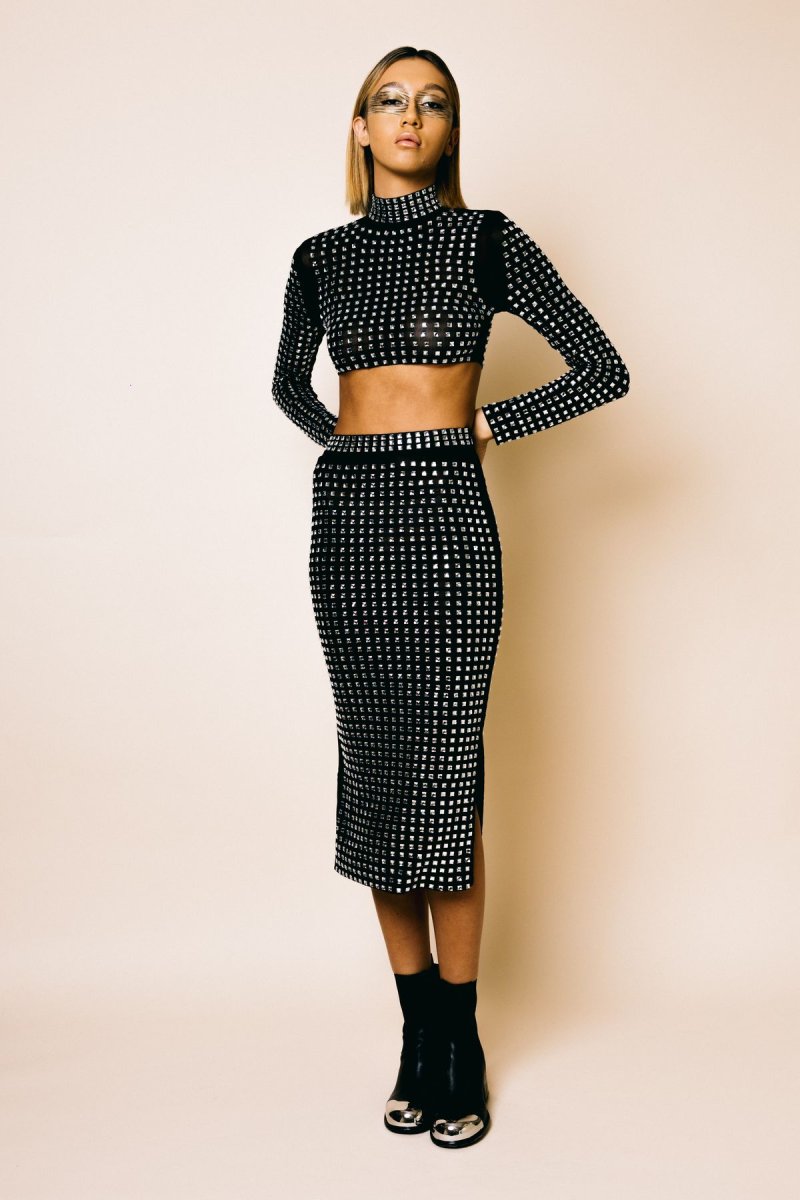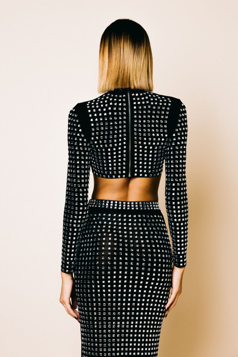 Crop top manica lunga in tulle tempestato di gemme crystal