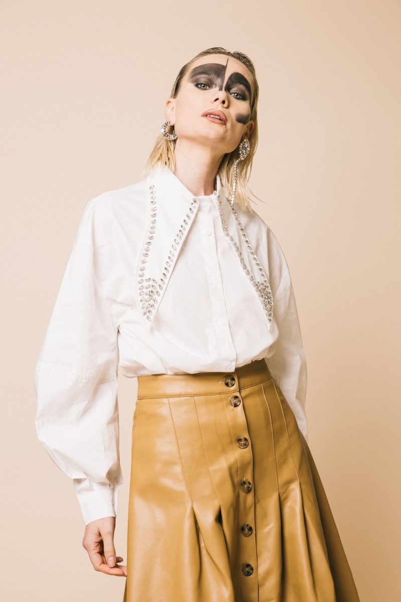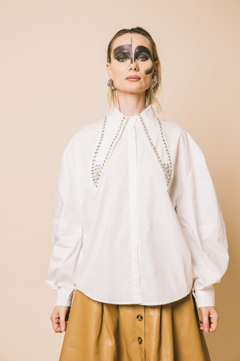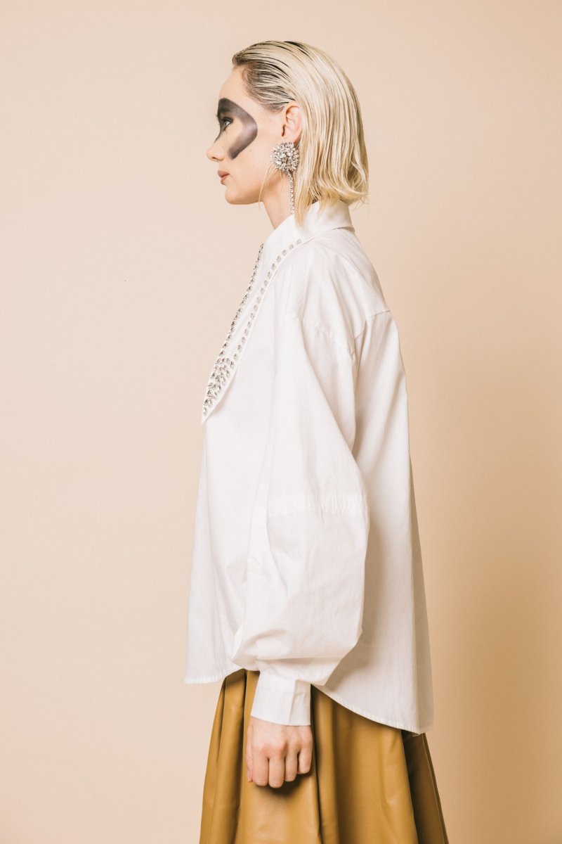Camicia over in cotone, dettaglio colletto a punta con strass crystal, manica a palloncino