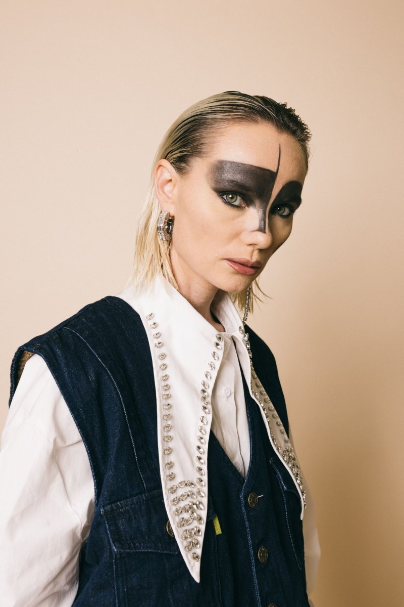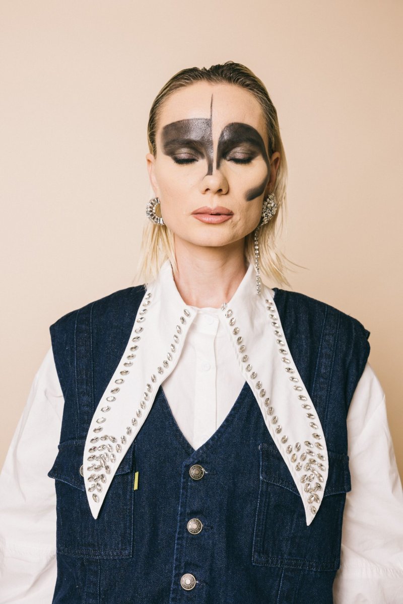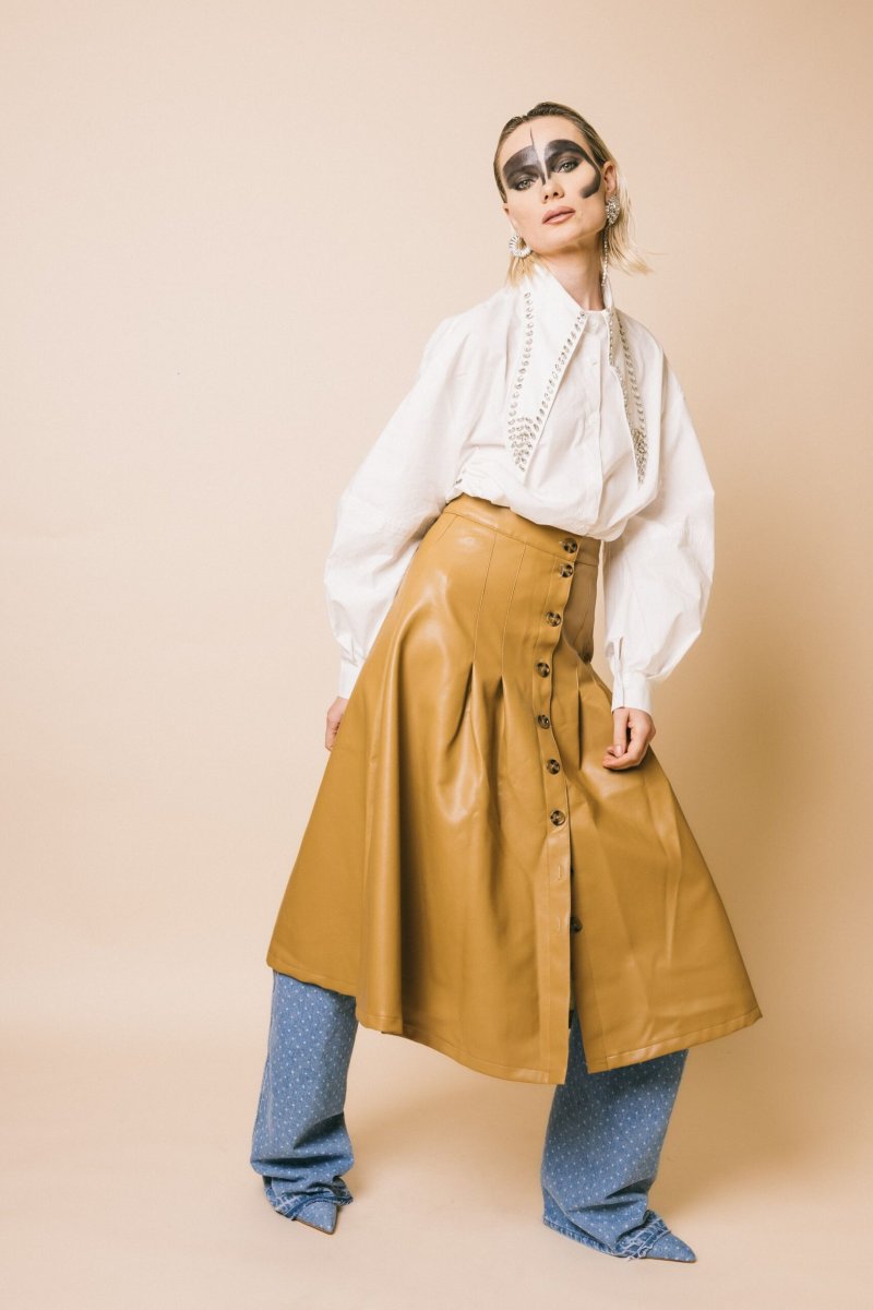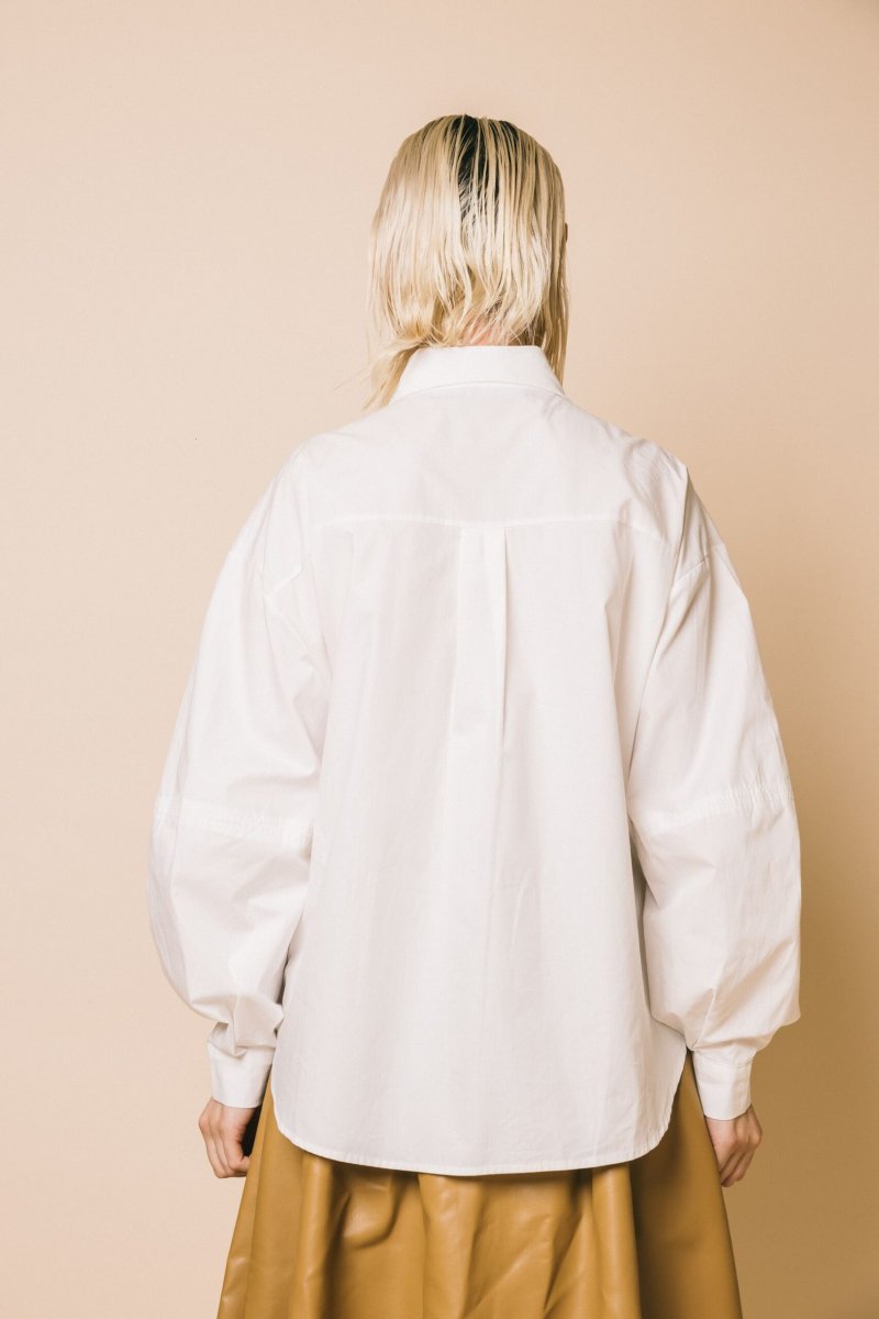Camicia over in cotone, dettaglio colletto a punta con strass crystal, manica a palloncino