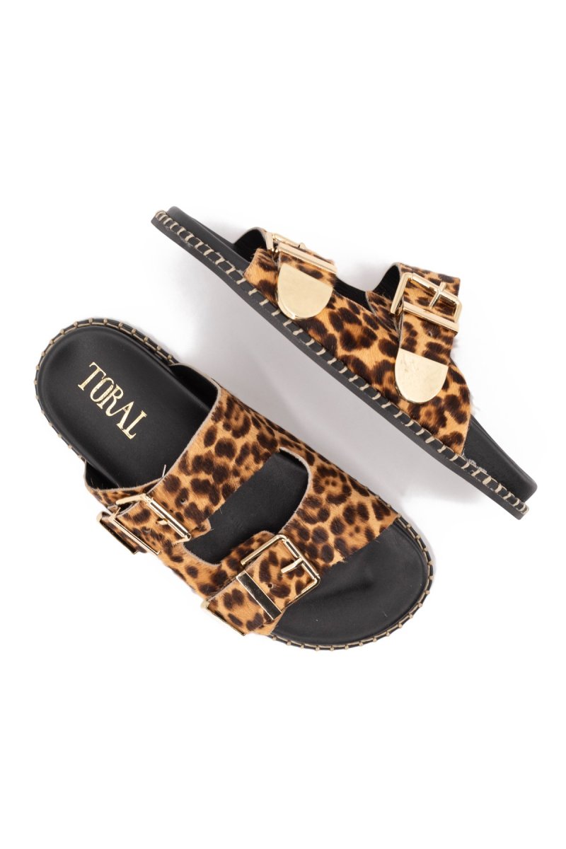 Sandali Hidra in cavallino, un’ode all’estate più grintosa, accendono il look con la loro stampa leopardata su pony skin, doppia fibbia dorata e cuciture e carattere. La linea slip-on assicura libertà e praticità, mentre ogni dettaglio sussurra stile. Per chi ama distinguersi con eleganza. Suola: in pelle 2 cm con cuciture a contrasto *Made in Spagna