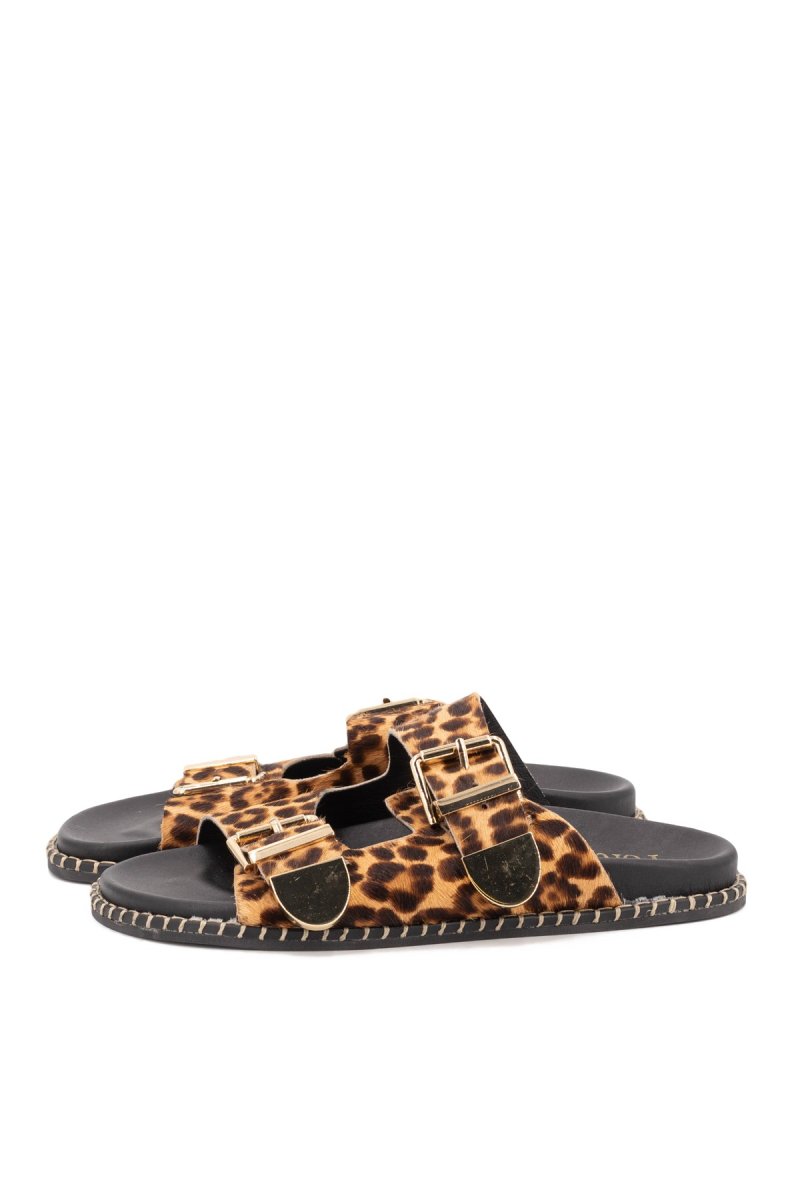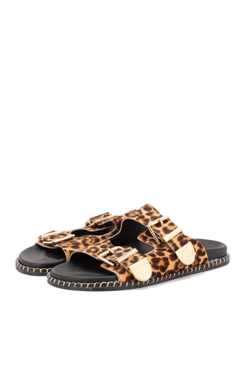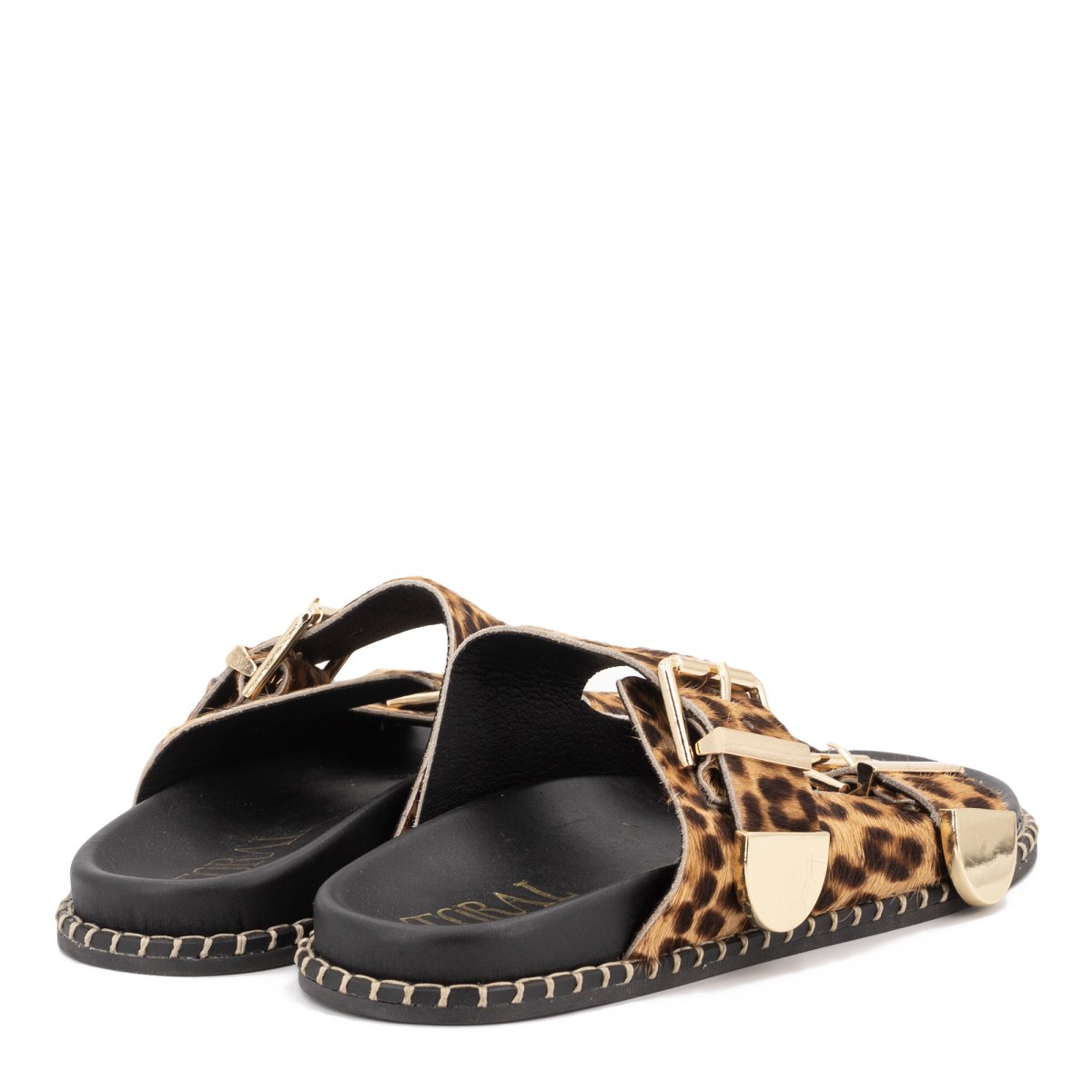 Sandali Hidra in cavallino, un’ode all’estate più grintosa, accendono il look con la loro stampa leopardata su pony skin, doppia fibbia dorata e cuciture e carattere. La linea slip-on assicura libertà e praticità, mentre ogni dettaglio sussurra stile. Per chi ama distinguersi con eleganza.