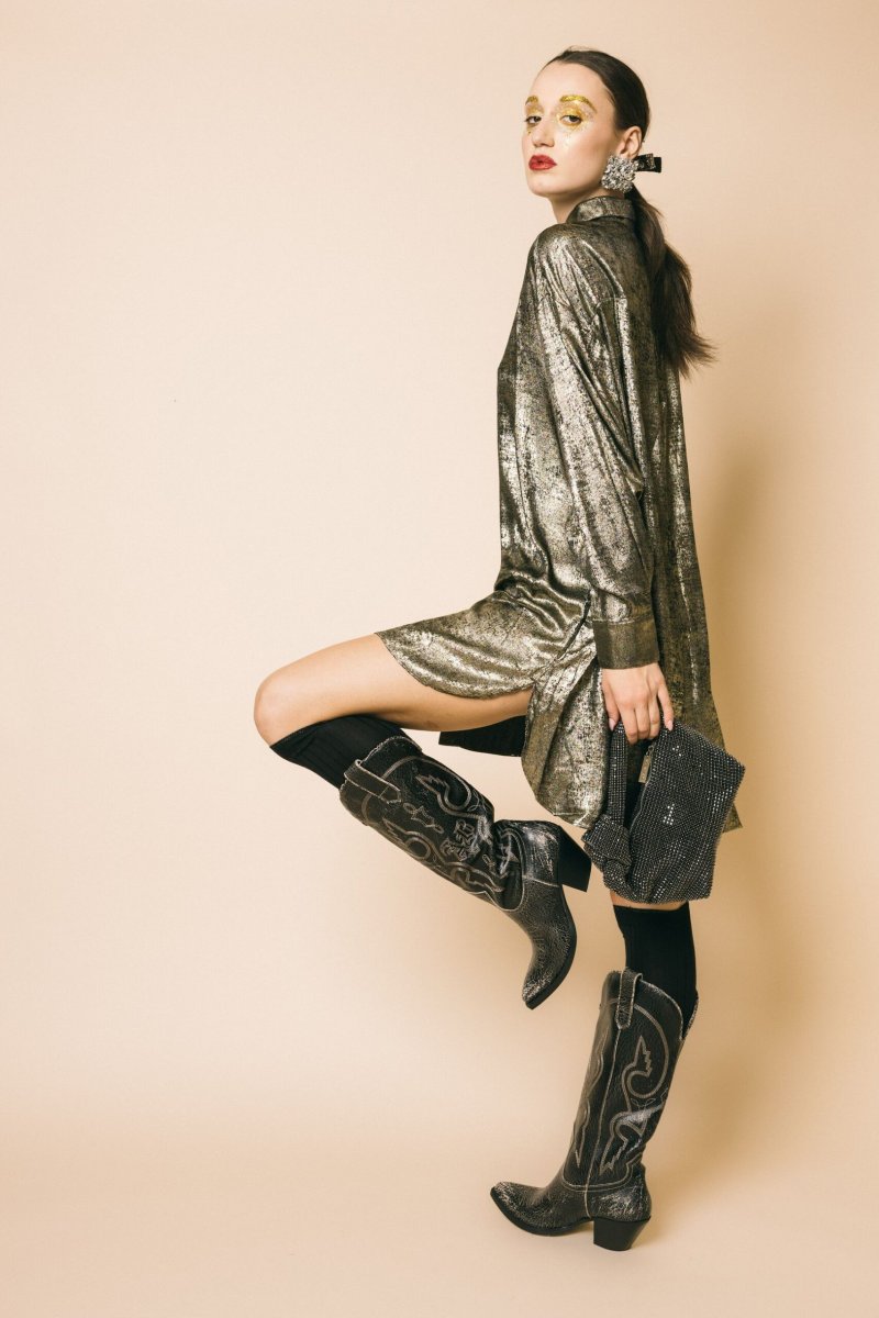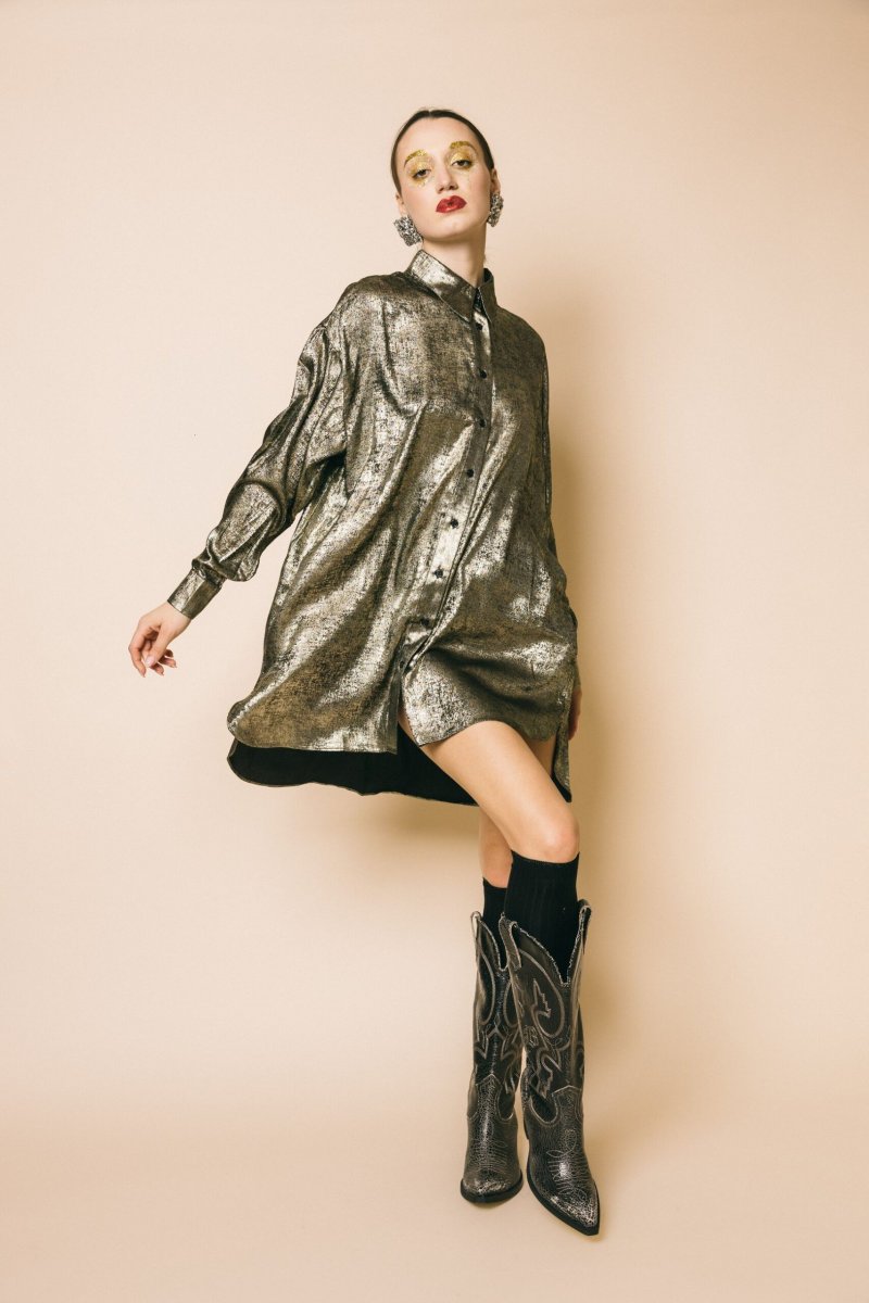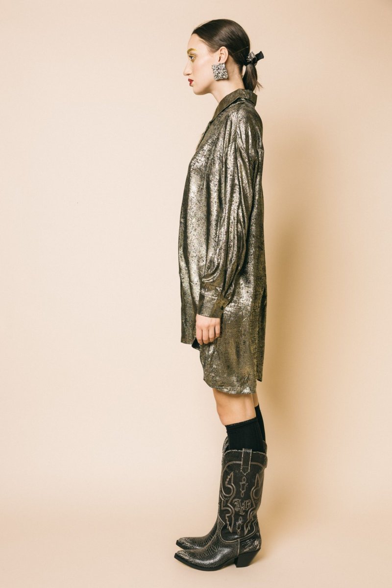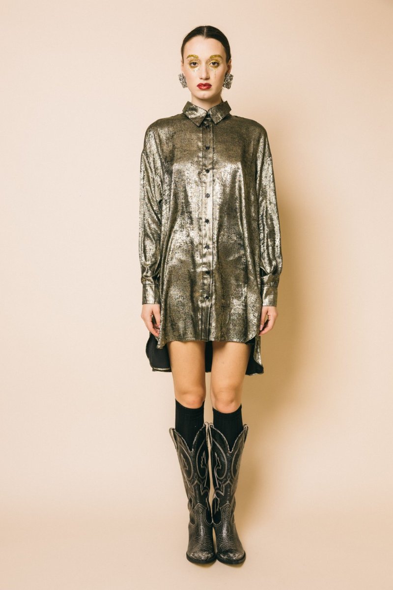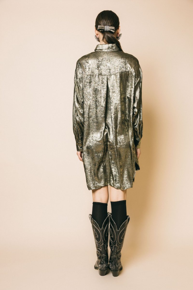 Abito camicia asimmetrico in tessuto effetto sfumato gold