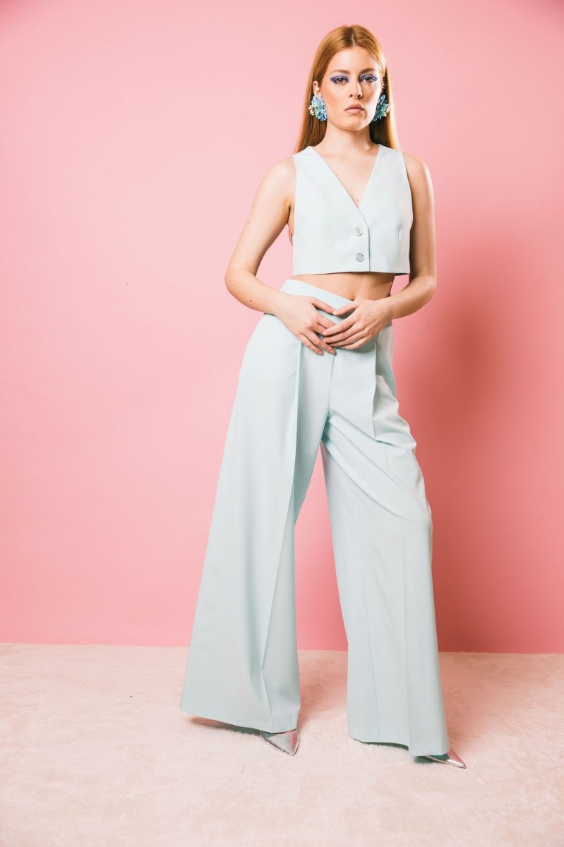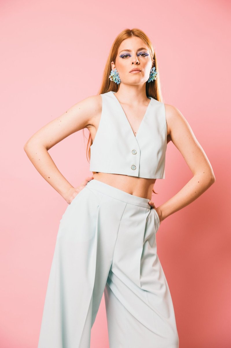 Top corto modello gilet in tessuto fluido, caratterizzato da bottoni smaltati tono su tono con effetto a righe. Le spalline sottili e regolabili, insieme alla leggera apertura sul fondo e alle tasche a pattina, conferiscono al capo un tocco sofisticato e moderno. Ideale per completare un outfit femminile e ricercato.