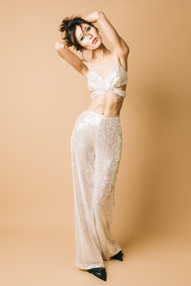 Top bralette in paillettes con incrocio, chiusura zip a scomparsa Altezza modella: 1.78 Taglia indossata: 40