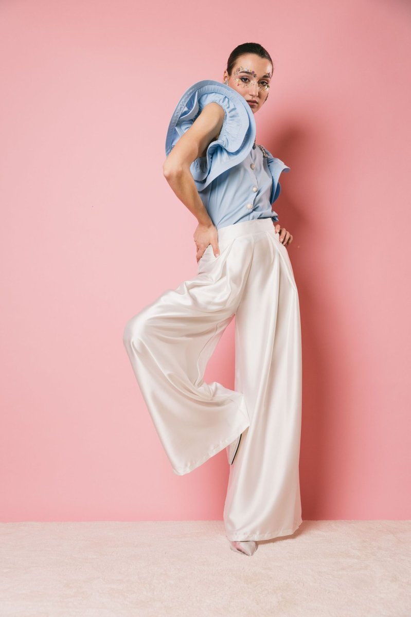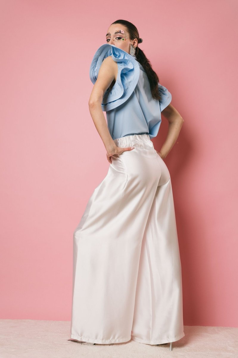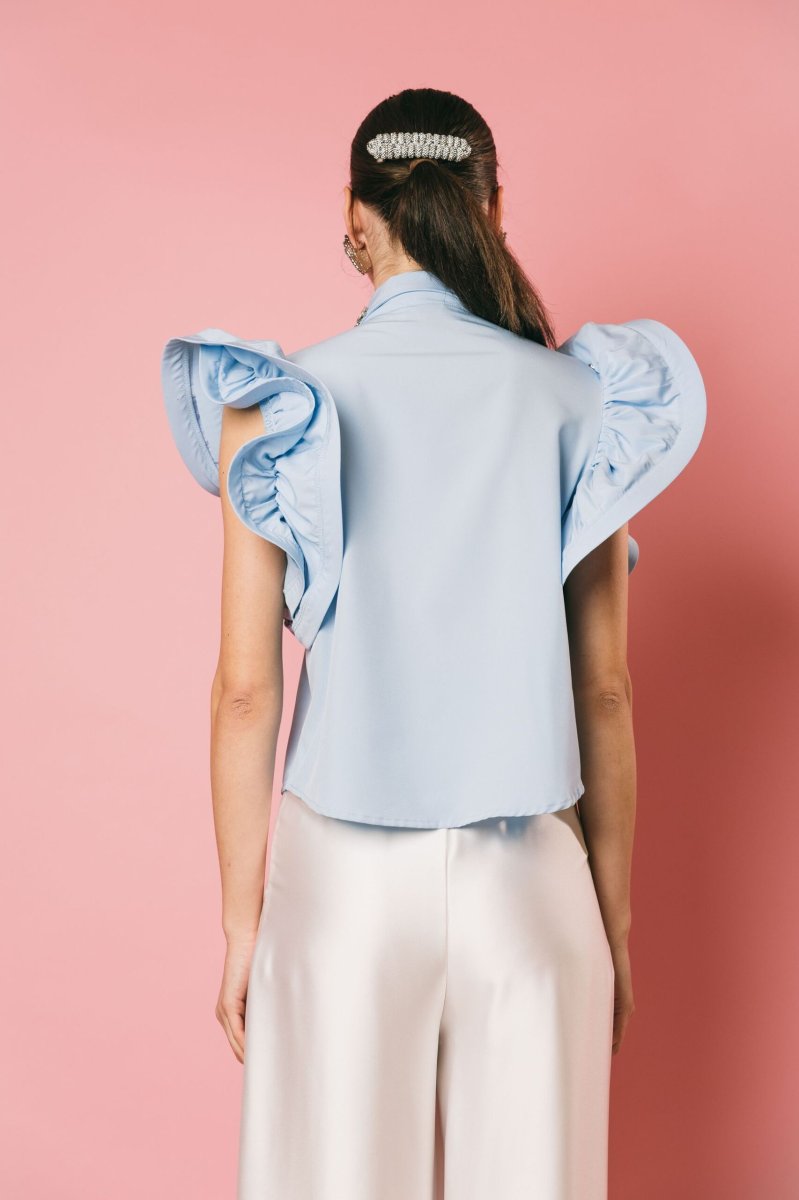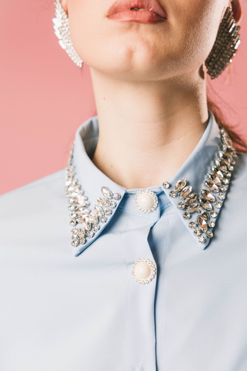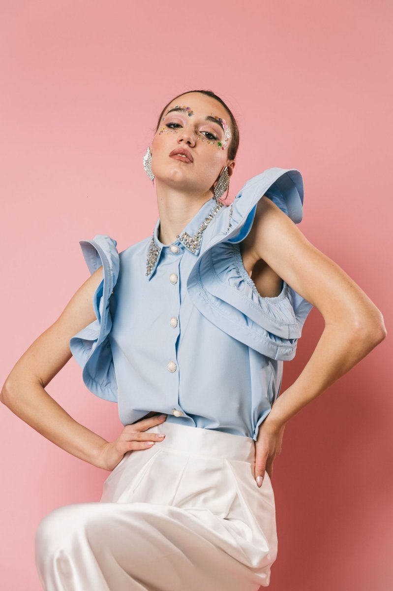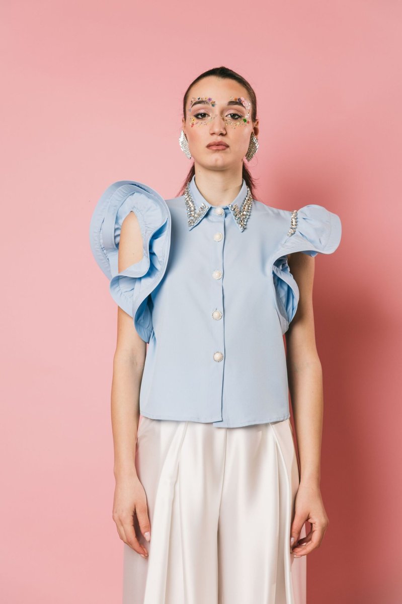Raffinata e luminosa, questa camicia smanicata in azzurro oxford unisce femminilità e carattere, le maxi rouge sulle spalle impreziosite da strass gioiello, donano un tocco sofisticato, mentre i bottoni con effetto madreperla con profilo strass aggiungono ulteriore ricercatezza.